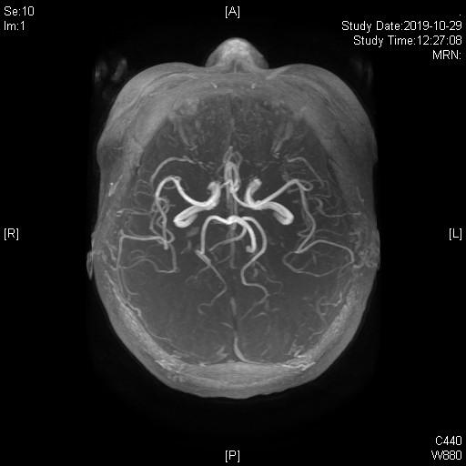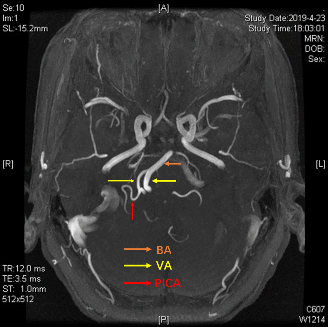 3D-TOF序列提示椎基底动脉迂曲,偏向右侧,小脑后下动脉PICA从劣势椎动脉发出,于上下各成一袢,最后绕回下方,呈“S”型。