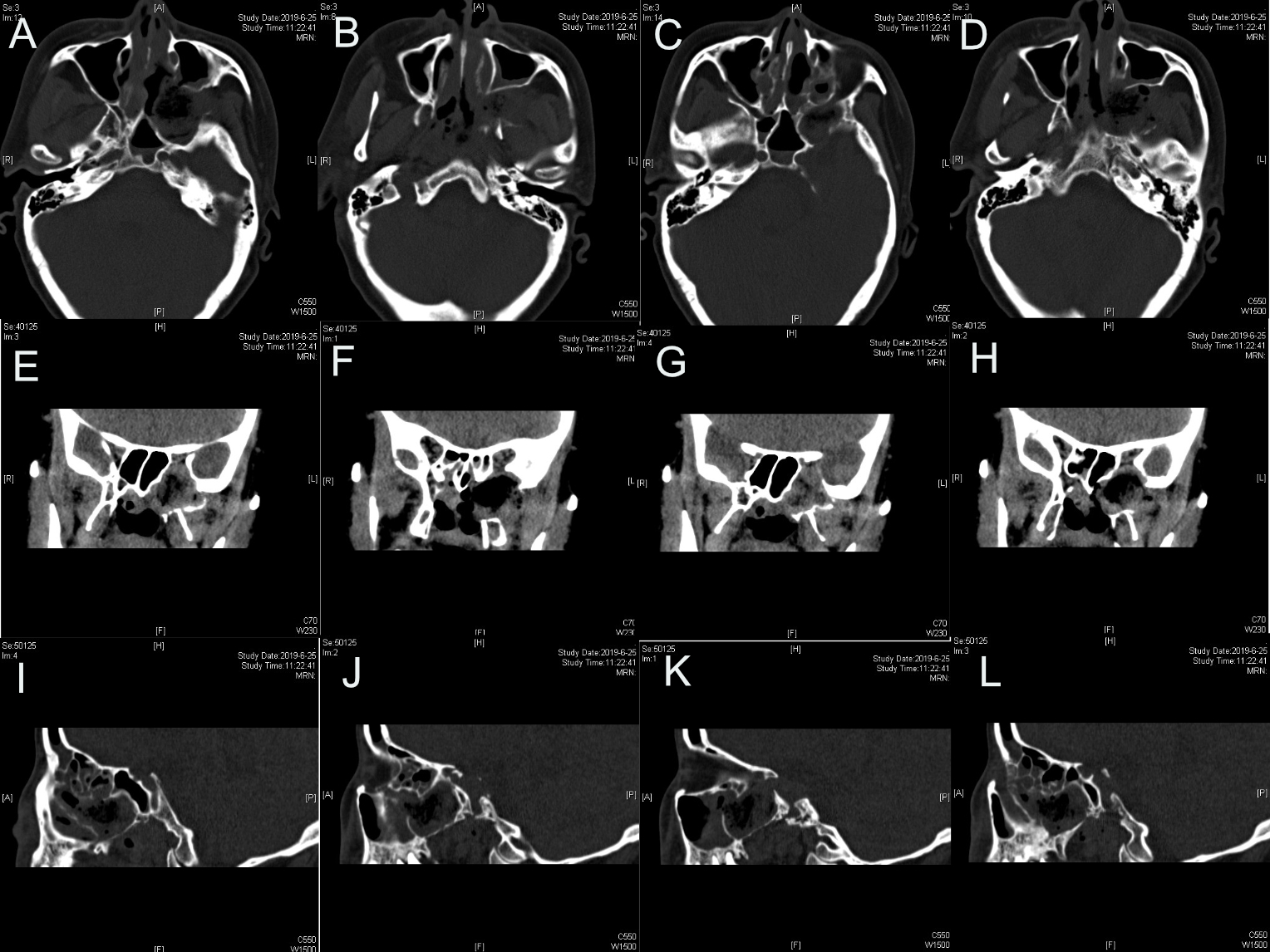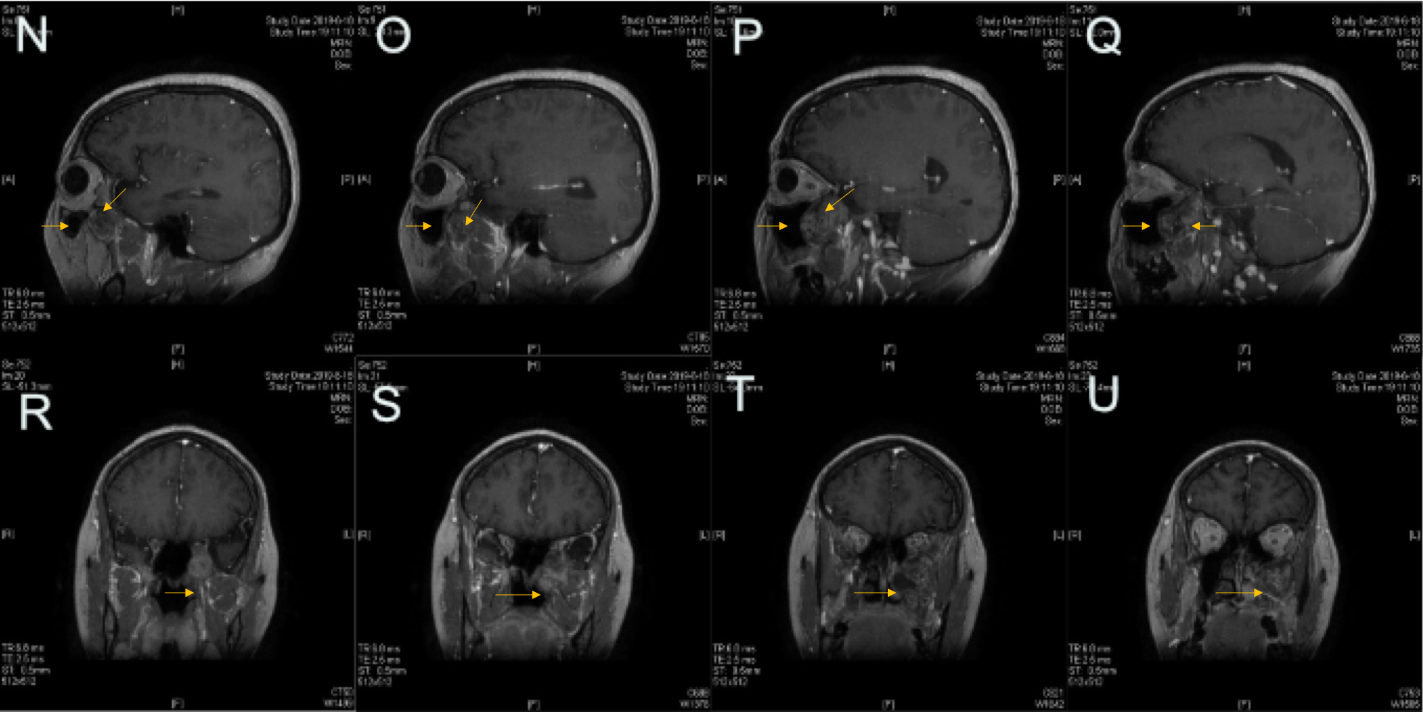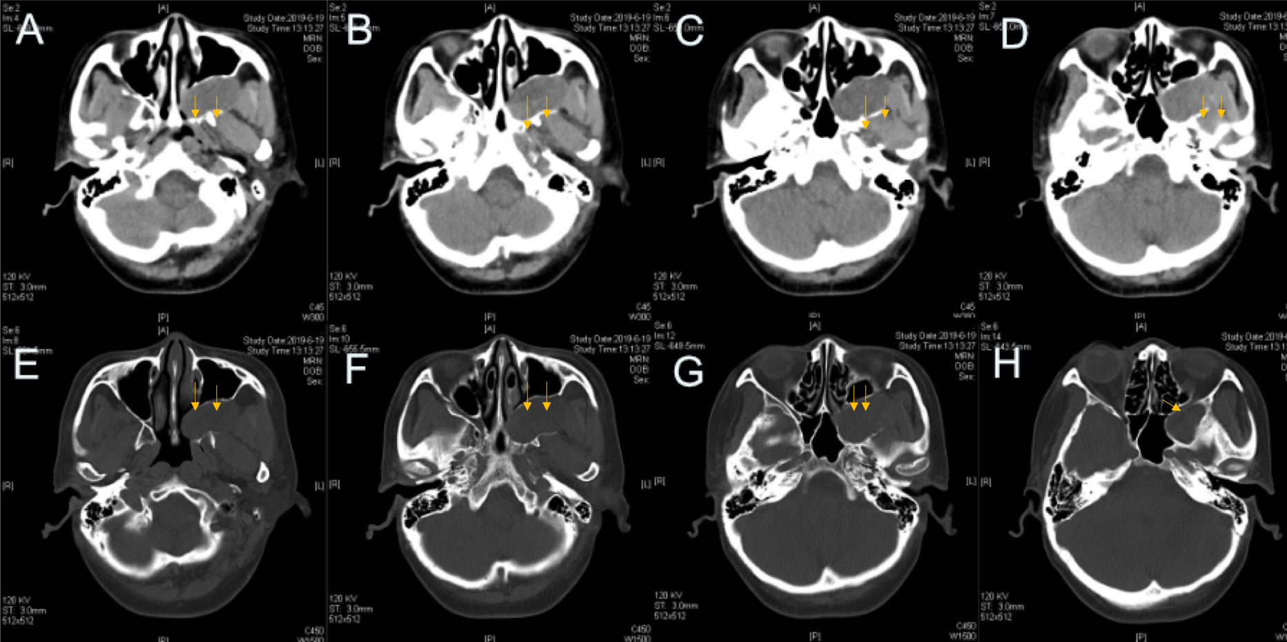 图2.PPF内肿瘤侵犯上颌窦后壁以及颞下窝,部分肿瘤向中颅底侵犯。