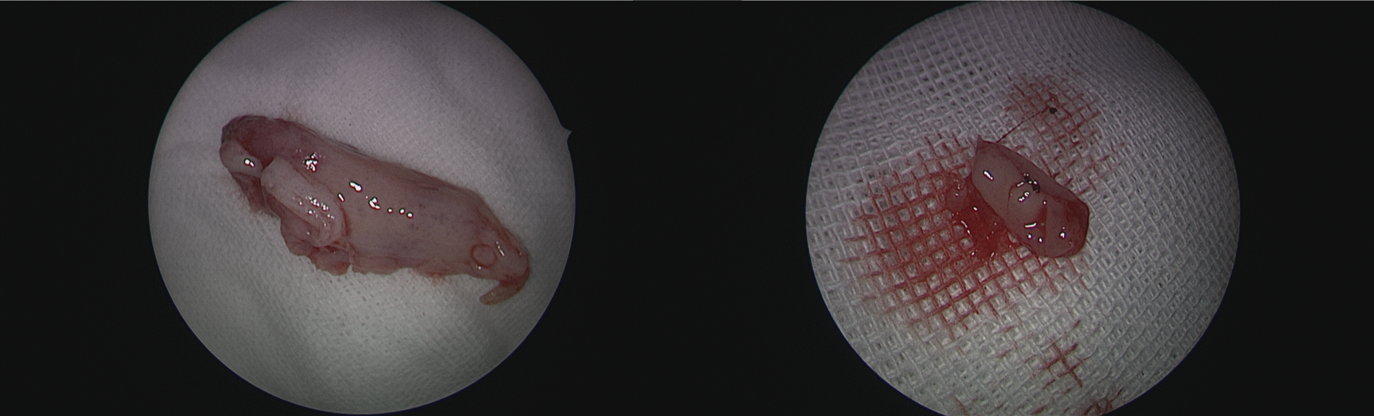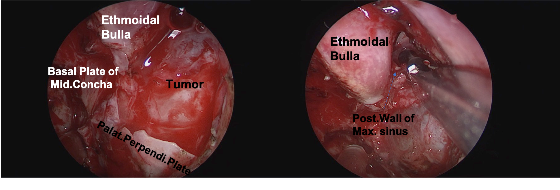 此病例肿瘤较大,且侵犯左侧上颌窦外侧壁与腭骨垂直板,经单入路不能完全切除肿瘤组织,故采用经鼻-上颌窦/腭骨垂直板联合入路(如图14-15)。针对翼腭窝肿瘤,神经内镜视野下尽可能的减少翼腭窝内血管以及神经的损伤,更有效的去除肿瘤组织。