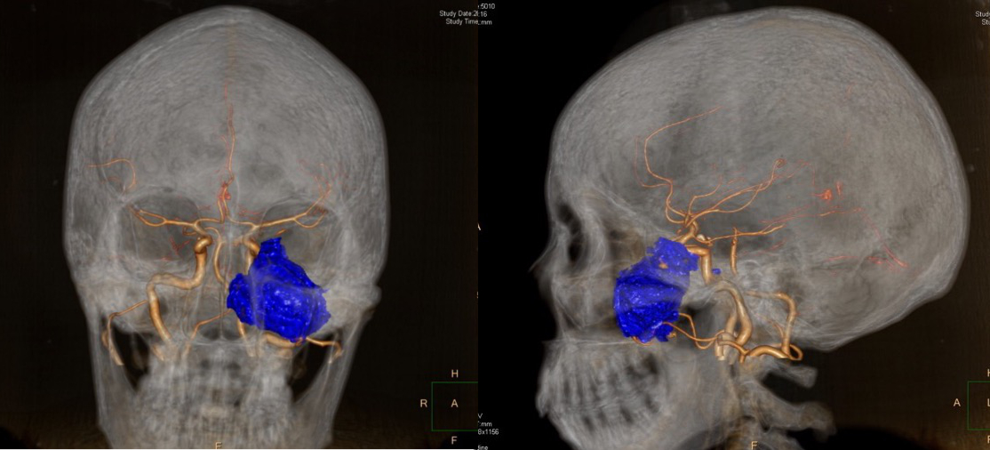 图1.蝶鞍区CT:左侧颅底见梭形软组织密度影,大小约3.7*1.9㎝,周围骨质受压变薄。