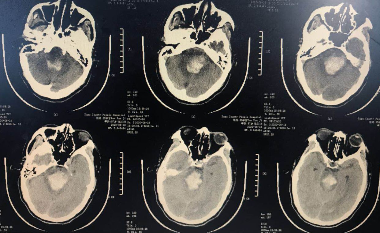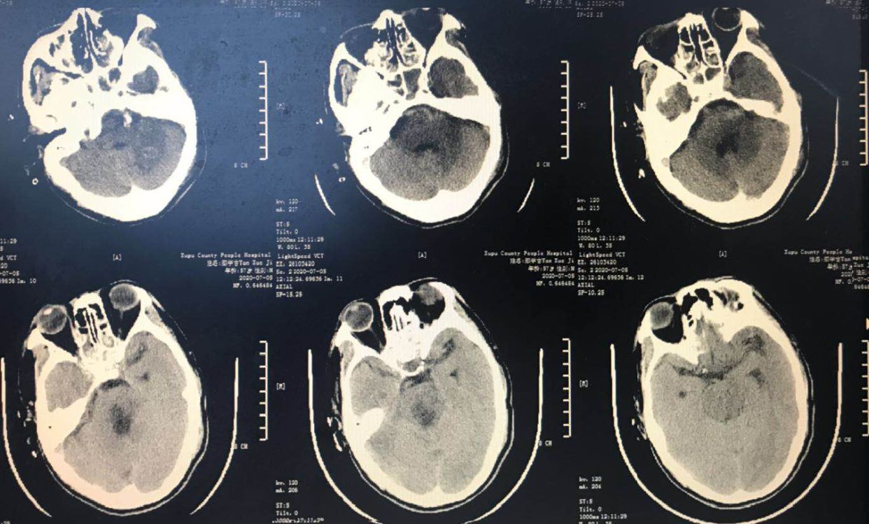 患者男性,57岁,溆浦县人,突发意识障入院。入院体查:血压:185/105mhg,深昏迷GCS评分( EIVTM1),左瞳孔4.5mm,右瞳孔2mm,对光反射消失,颈抗,四肢刺痛无反应,四肢肌张カ正常,病理征(+),脑膜刺激征(+)。