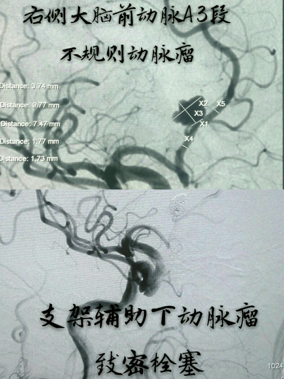 老年女性,头痛、头晕1年,并进行性加重,DSA示右侧大脑前动脉A3段不规则动脉瘤,支架辅助下顺利完成栓塞