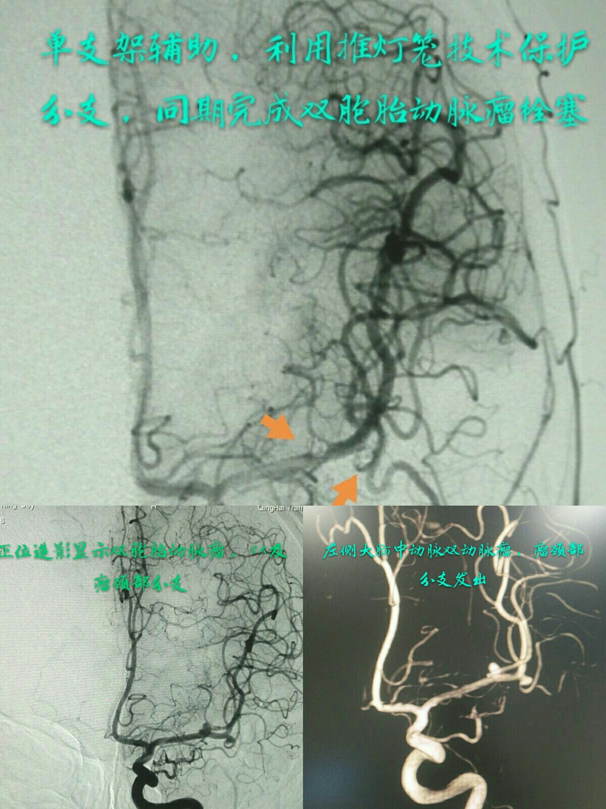 左侧大脑中动脉M2段双胞胎动脉瘤,用一个支架半释放方法栓塞远端动脉瘤,全释放后栓塞近段动脉瘤,术中用到了推“灯笼”技术