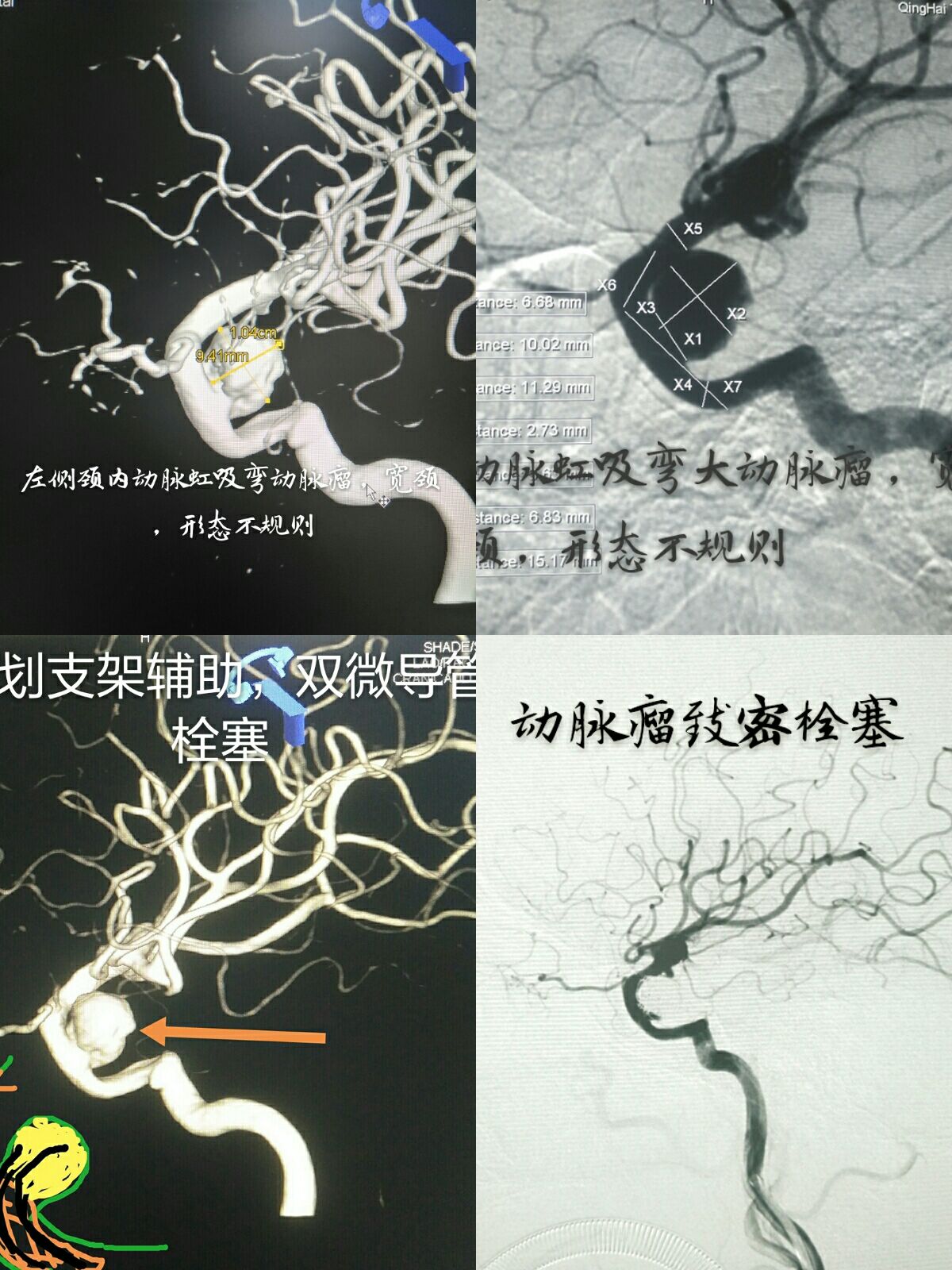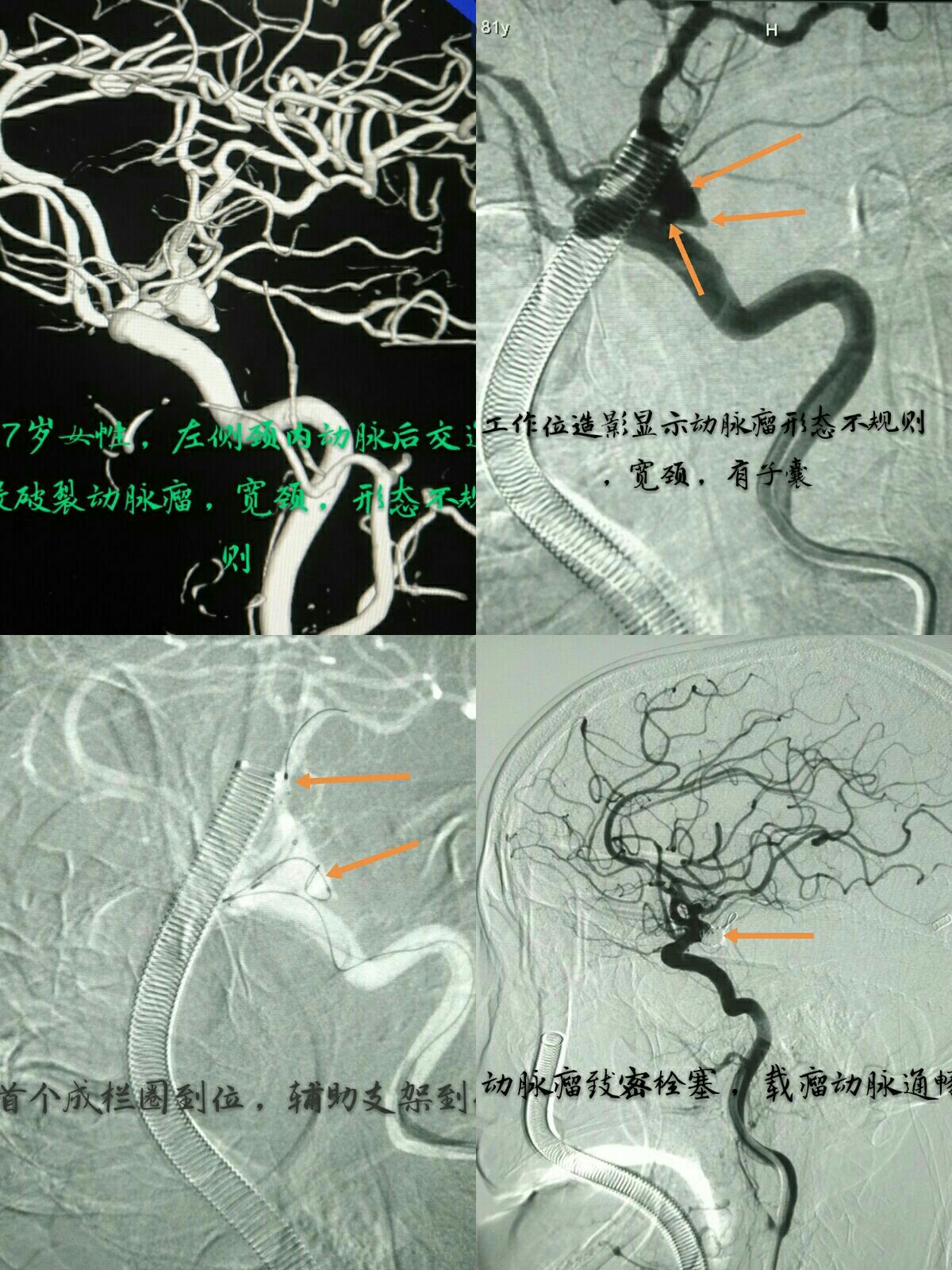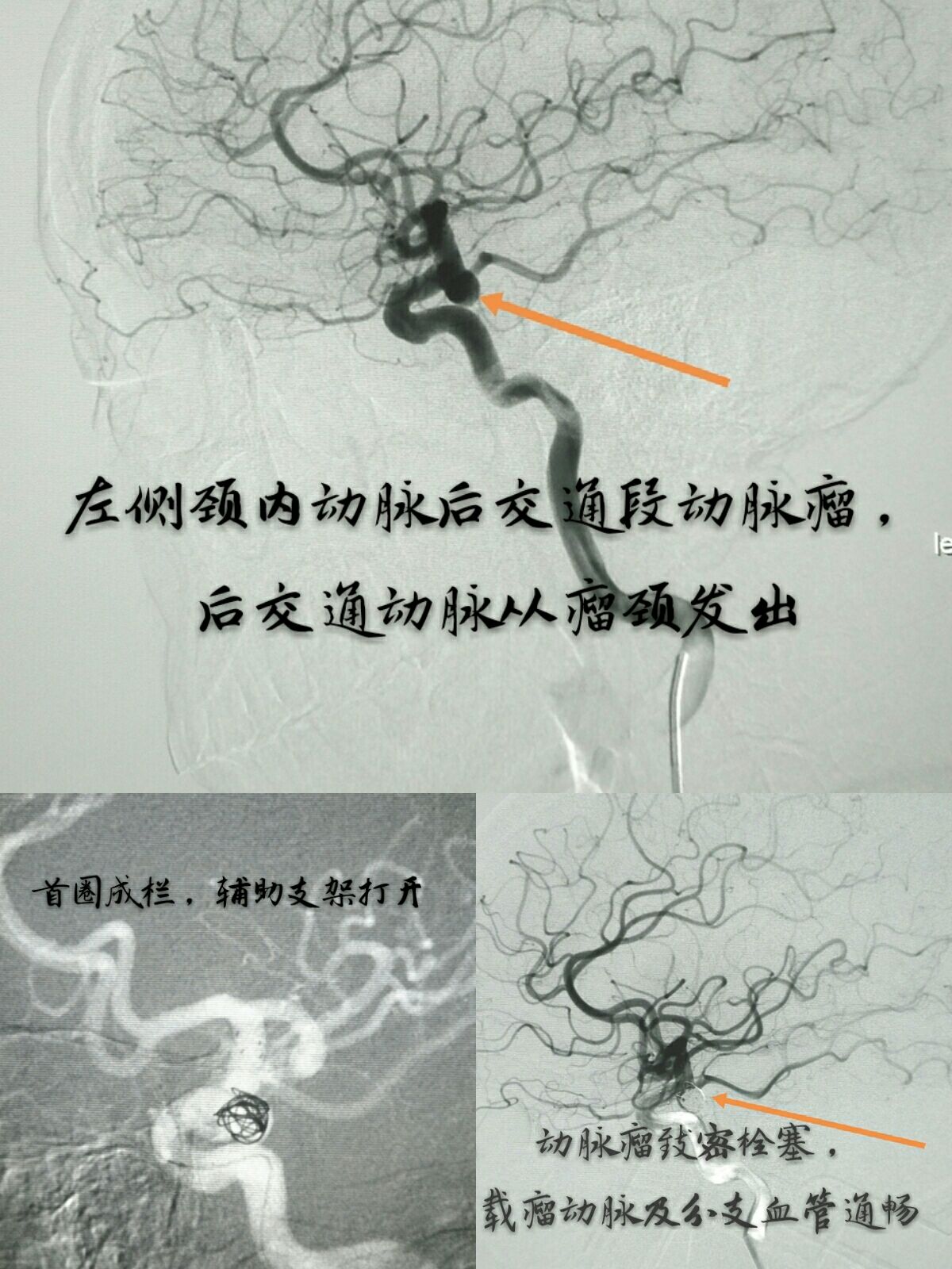 左侧颈内动脉后交通段动脉瘤,宽颈,瘤颈部发出后交通动脉,但同侧大脑后动脉P1段存在,使用弹簧圈成栏技术完成栓塞,术中后交通动脉牺牲,但无任何症状
