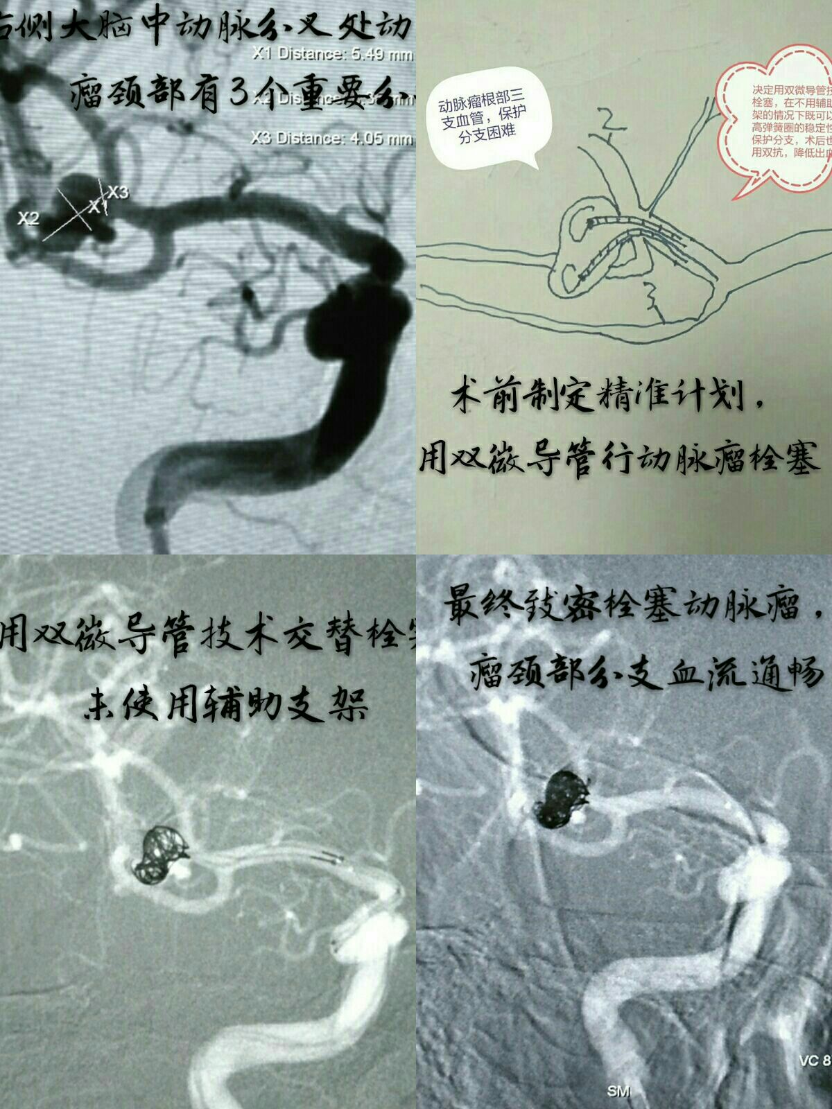中年男性患者,突发头痛、呕吐伴意识障碍,头颅CT示蛛网膜下腔出血,DSA示右侧大脑中动脉上干宽颈动脉瘤,瘤颈部分支众多,使用双微导管技术完成栓塞,载瘤动脉及分支血管保护良好