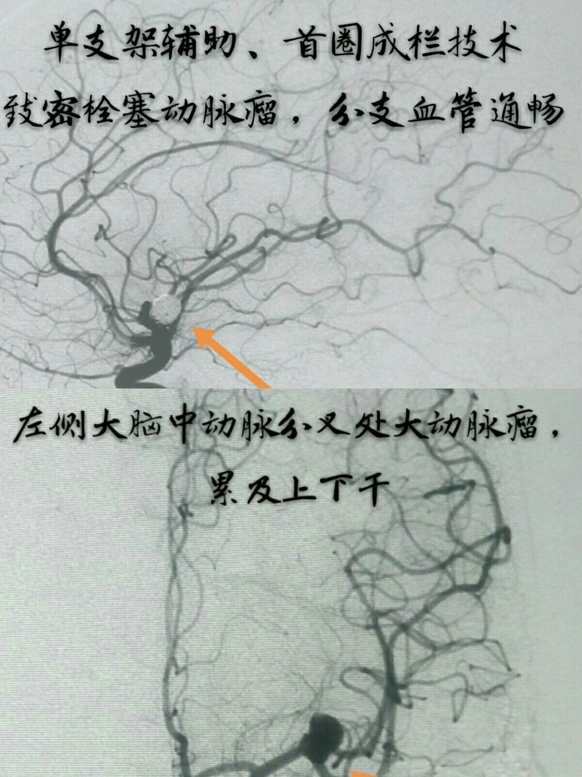 老年男性患者,脑鸣2年为主症,DSA发现左侧大脑中动脉下干宽颈大动脉瘤,载瘤动脉累及严重,术中使用成袢技术将支架导管送至大脑中动脉远端,成功栓塞动脉瘤,术后脑鸣消失