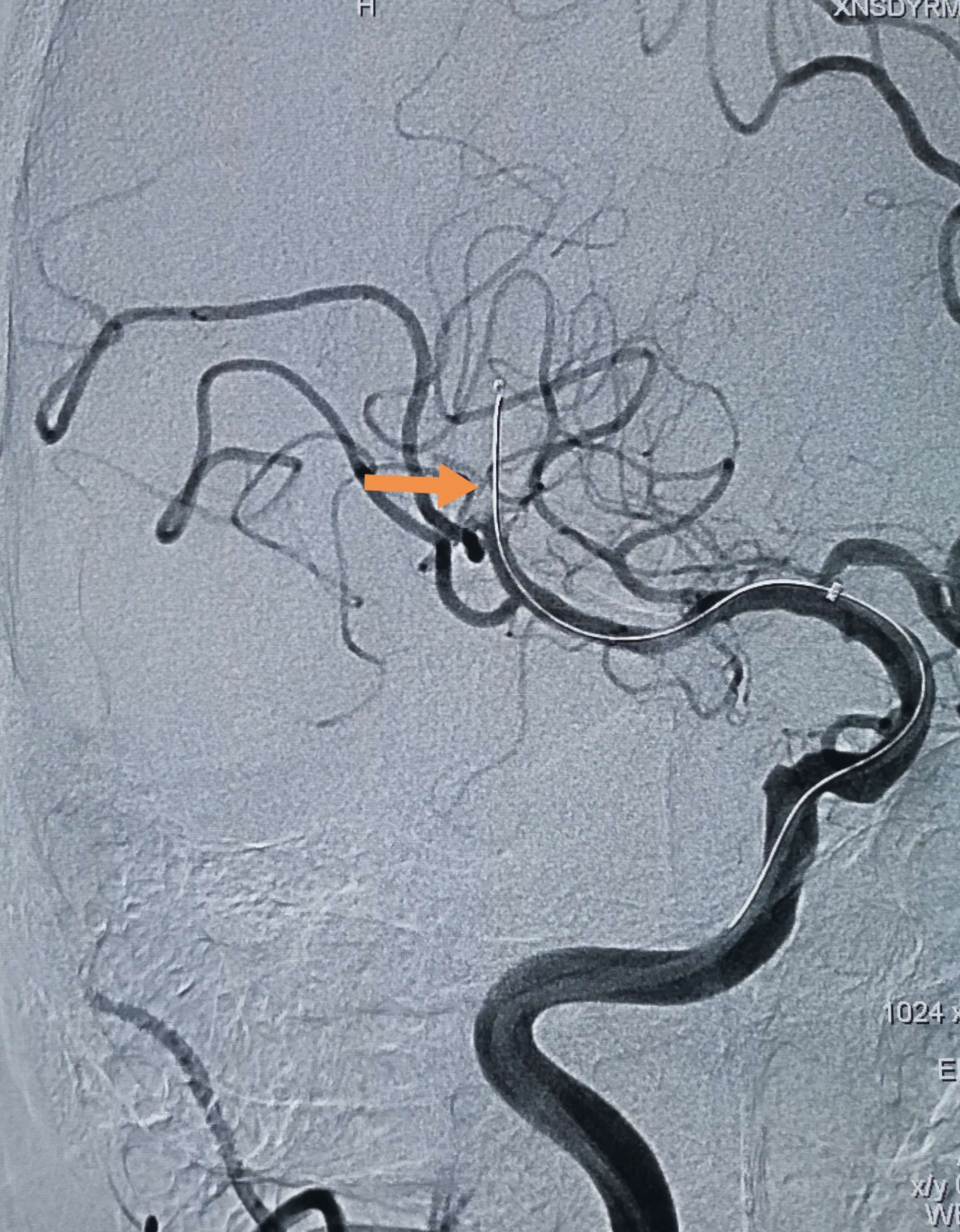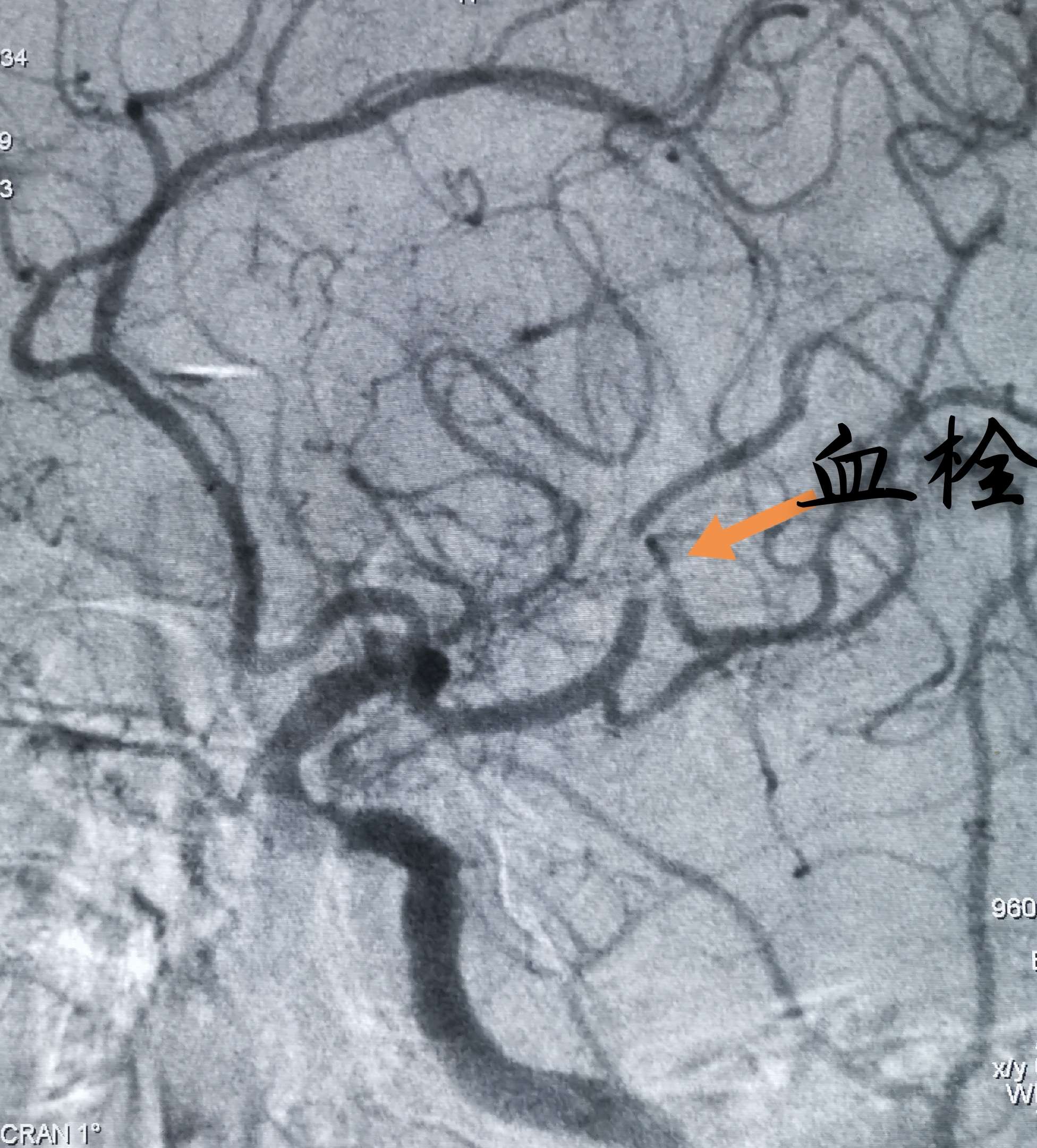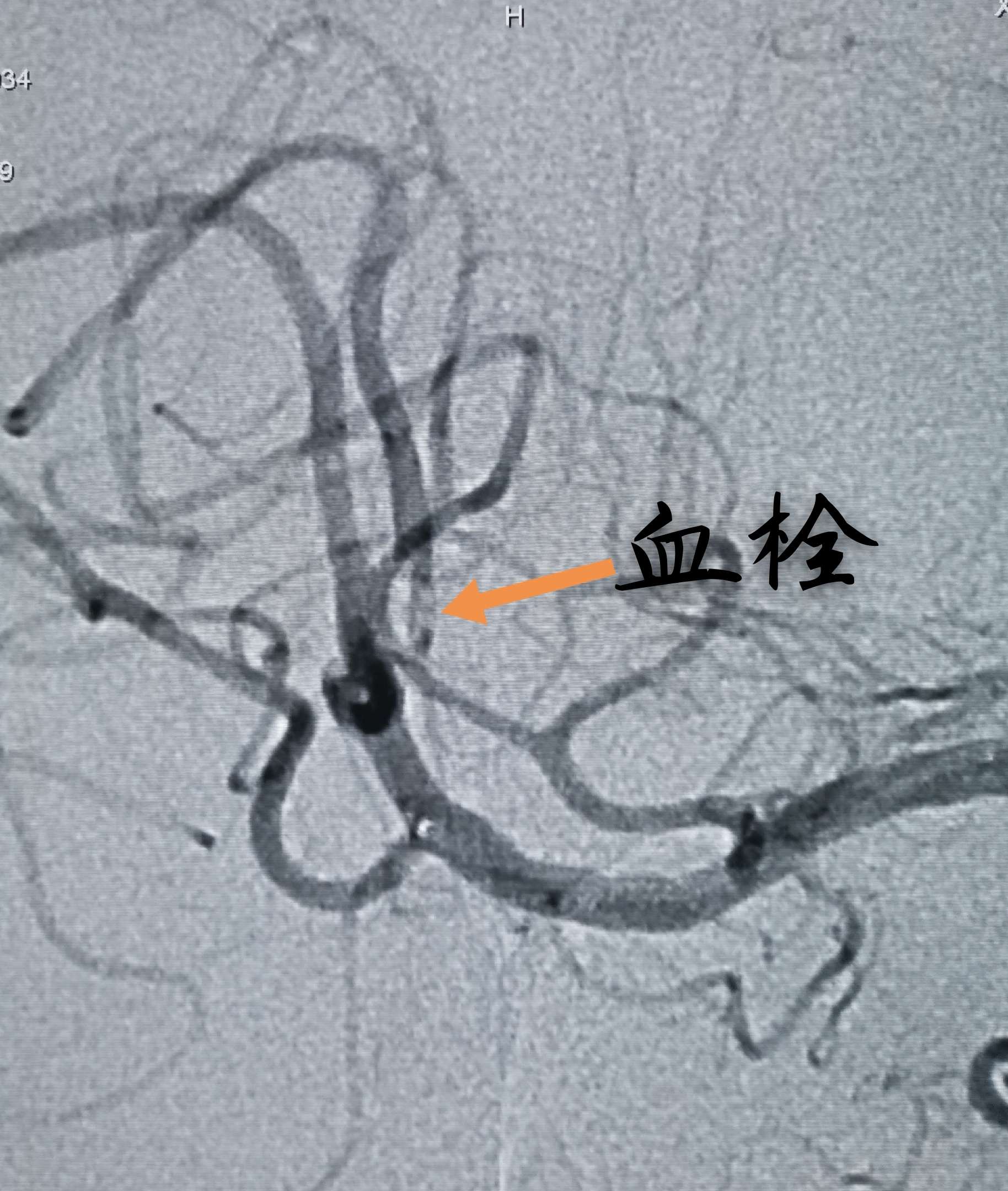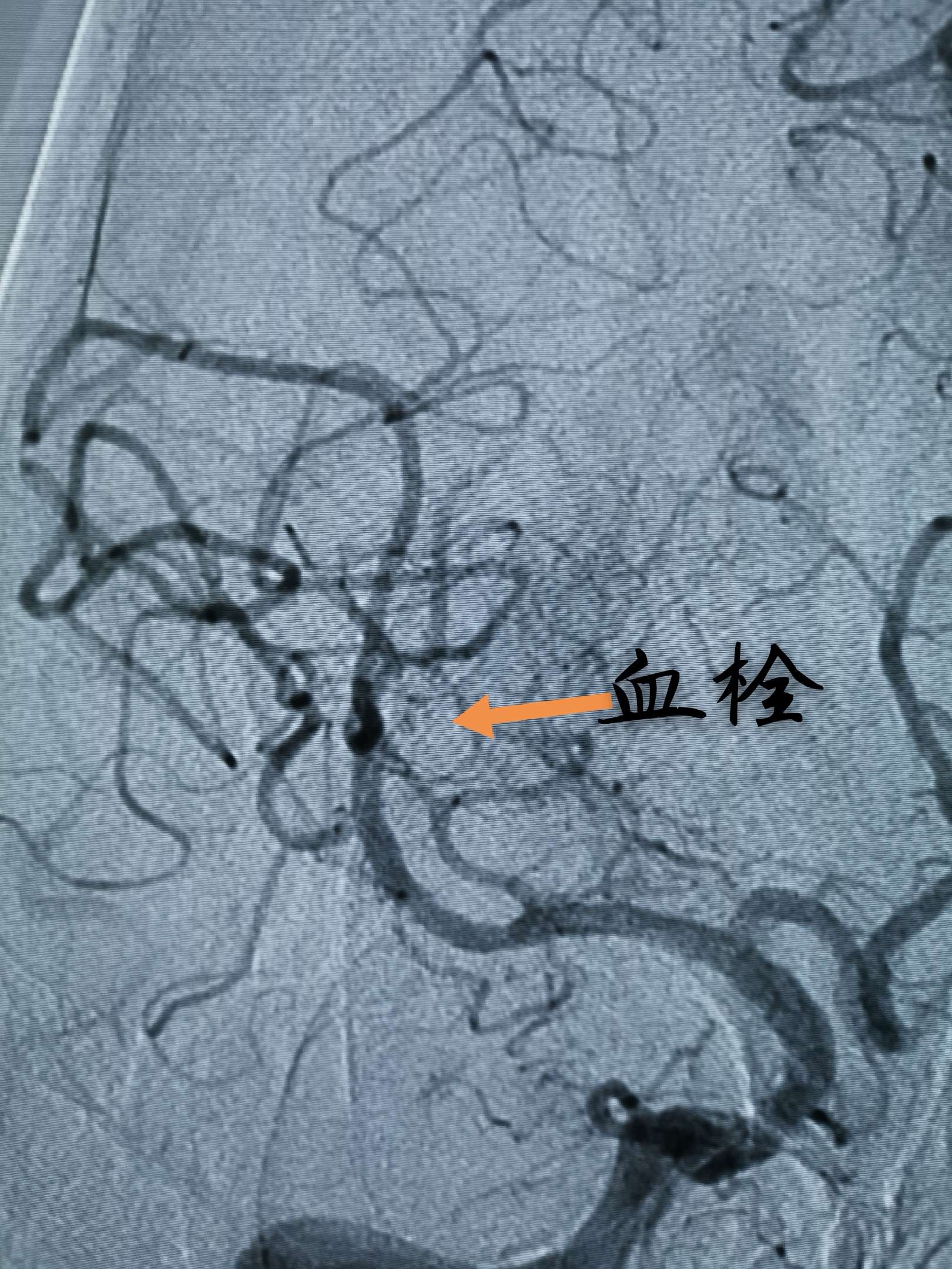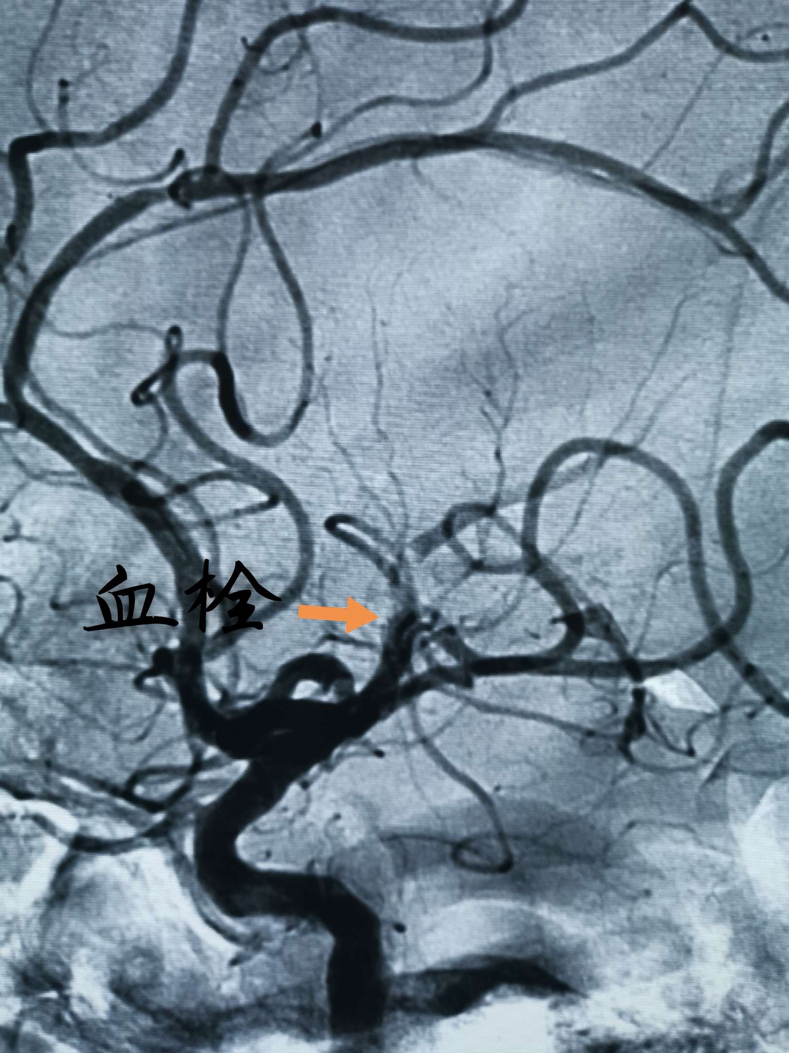 快速转运并完成DSA,发现右侧大脑中动脉M2、M3分叉处血栓,两大分支血流缓慢