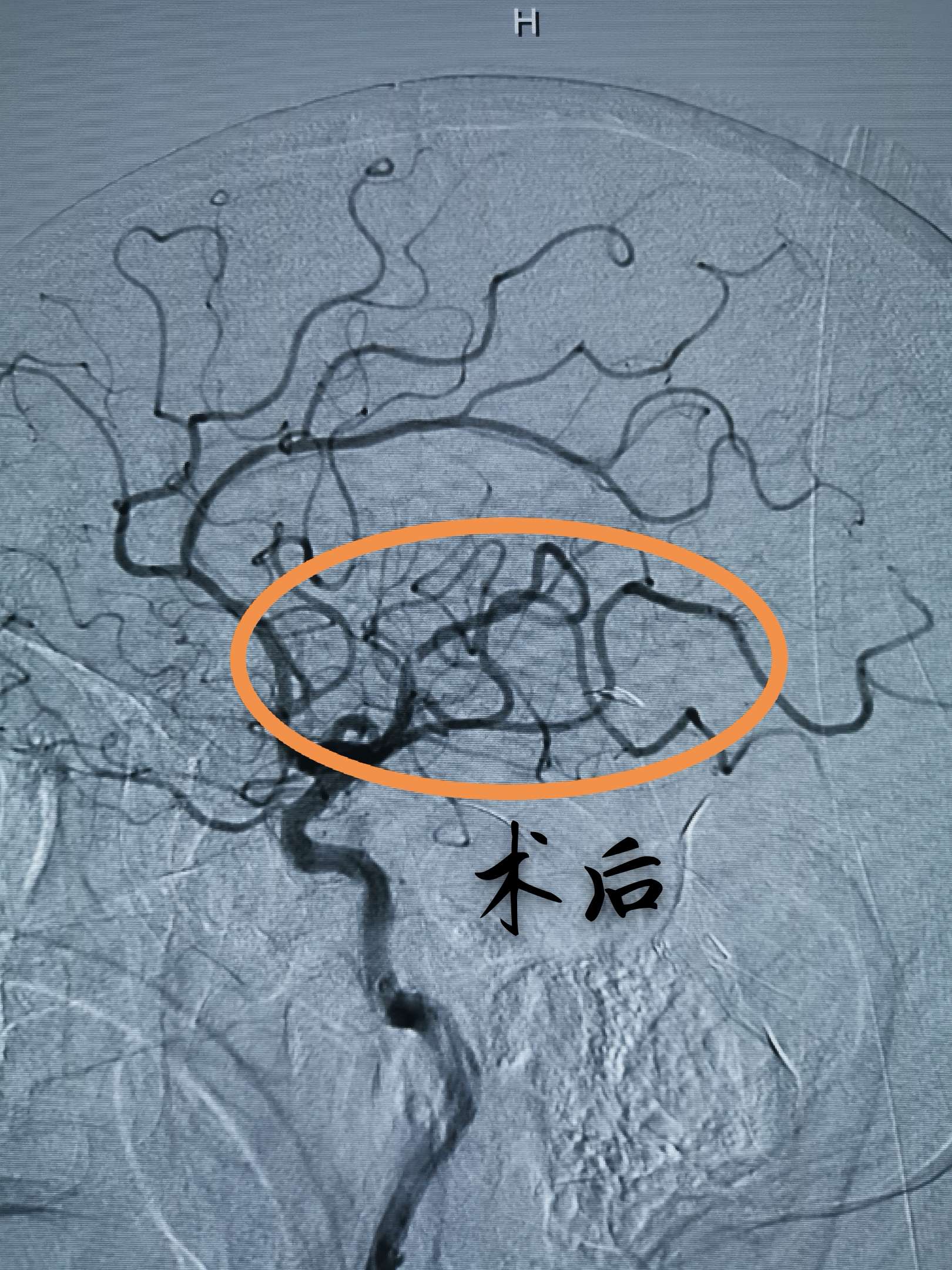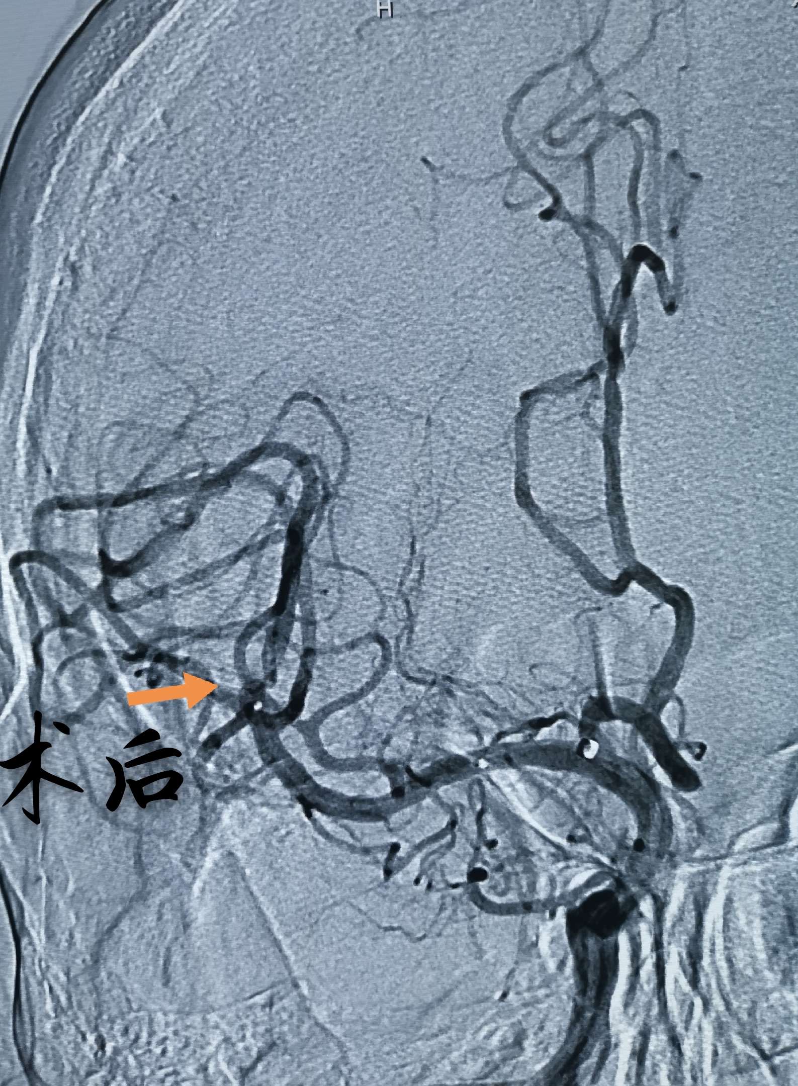 术后即刻,左侧肢体肌力明显恢复,已经能够抬离床面,此时,距离发病5小时,闭塞动脉完全开通