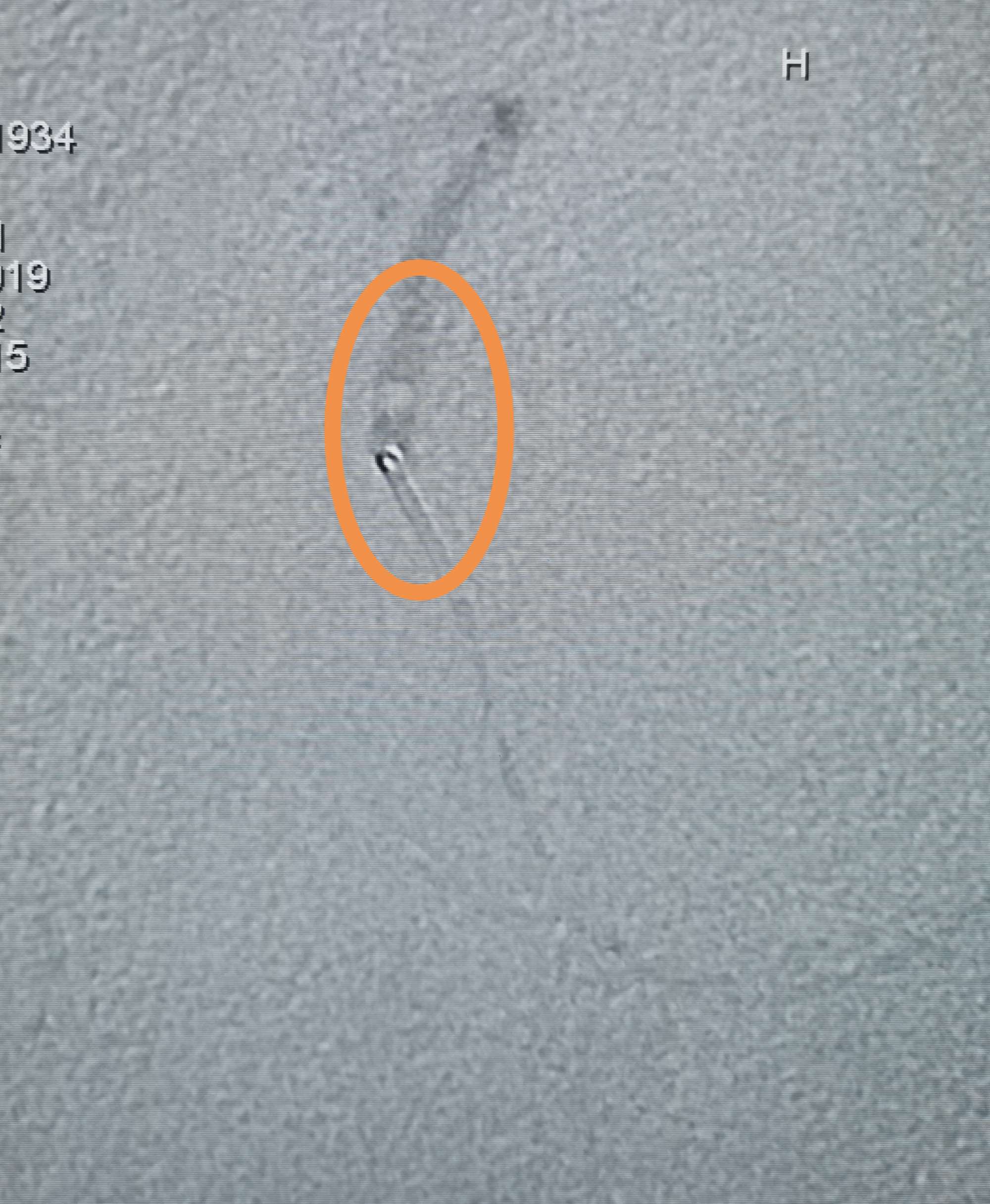 正侧位造影,血栓大部分被清理,有少量残留,但远端血流通畅,此时,患者开始说话,言语清晰流利,左侧肢体肌力开始恢复,静脉泵入替罗非班,收台