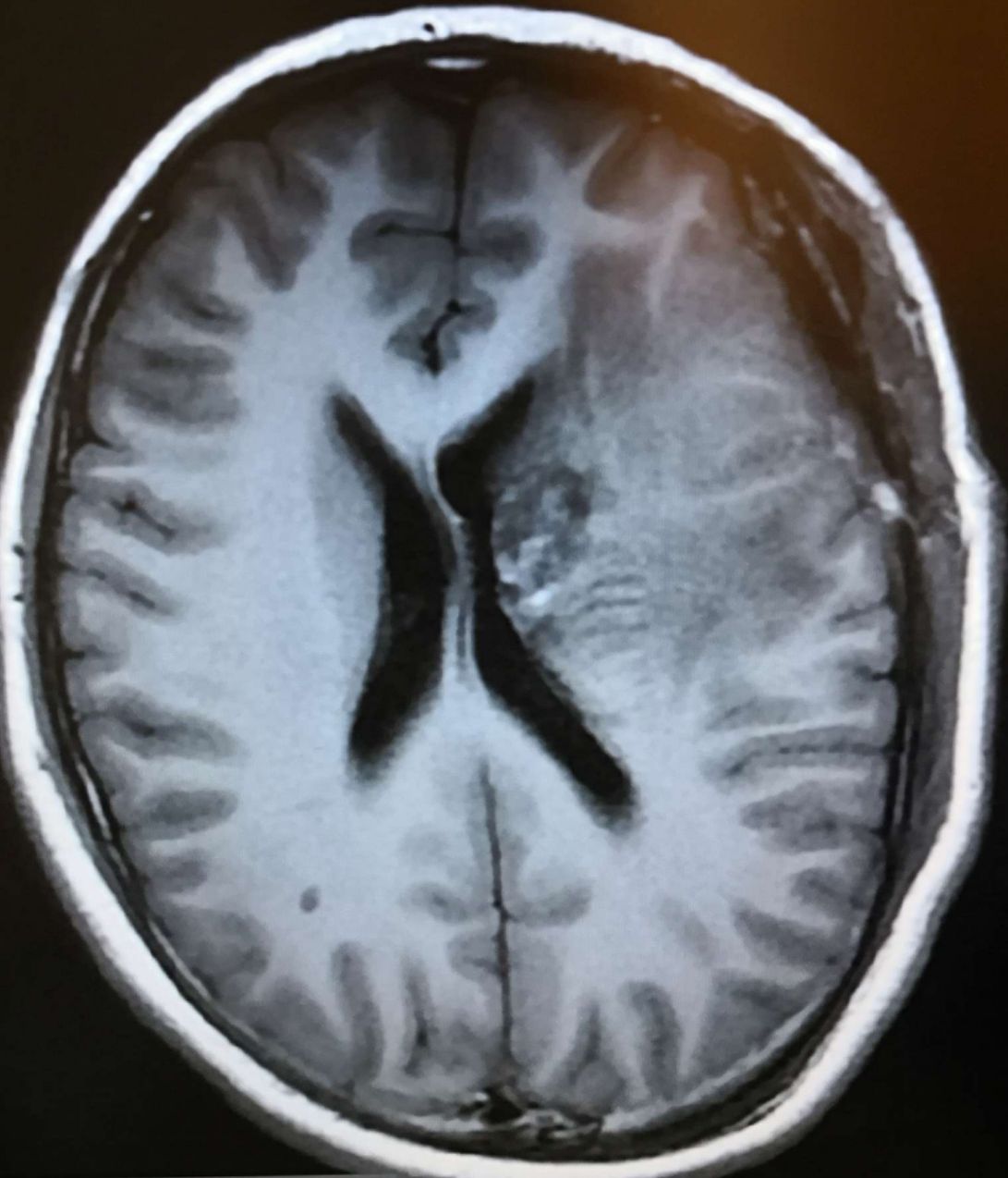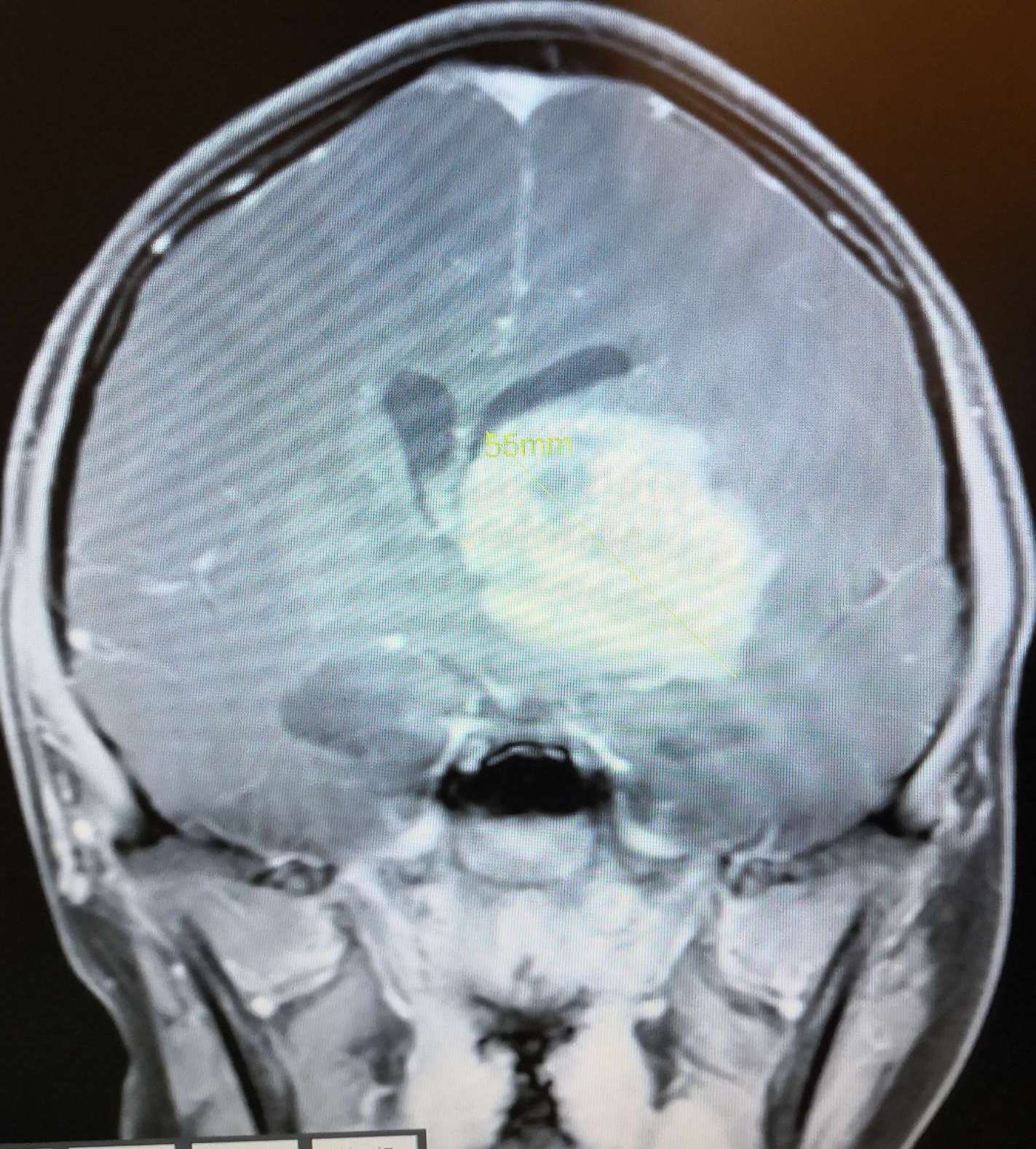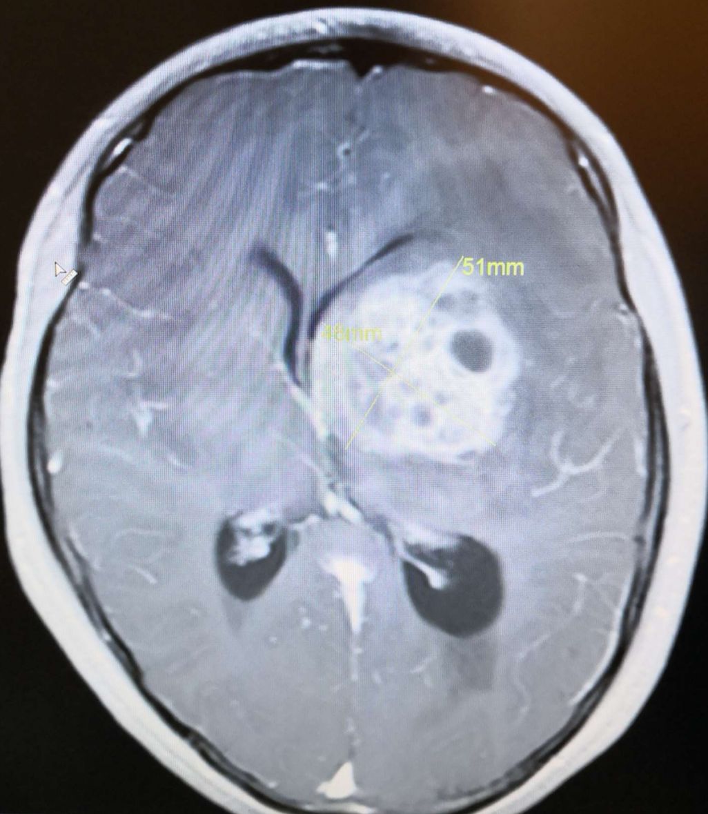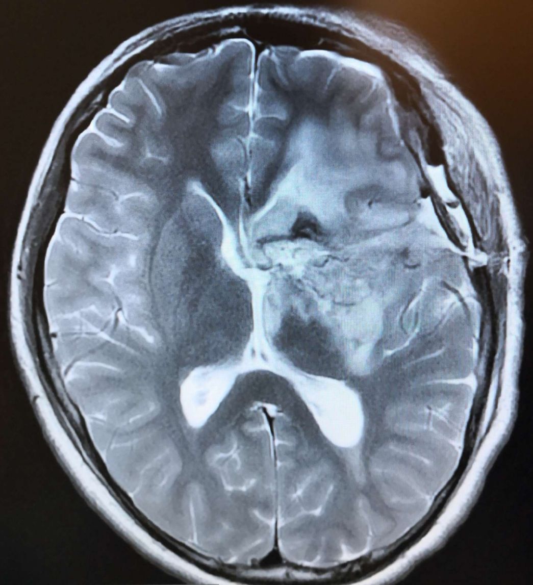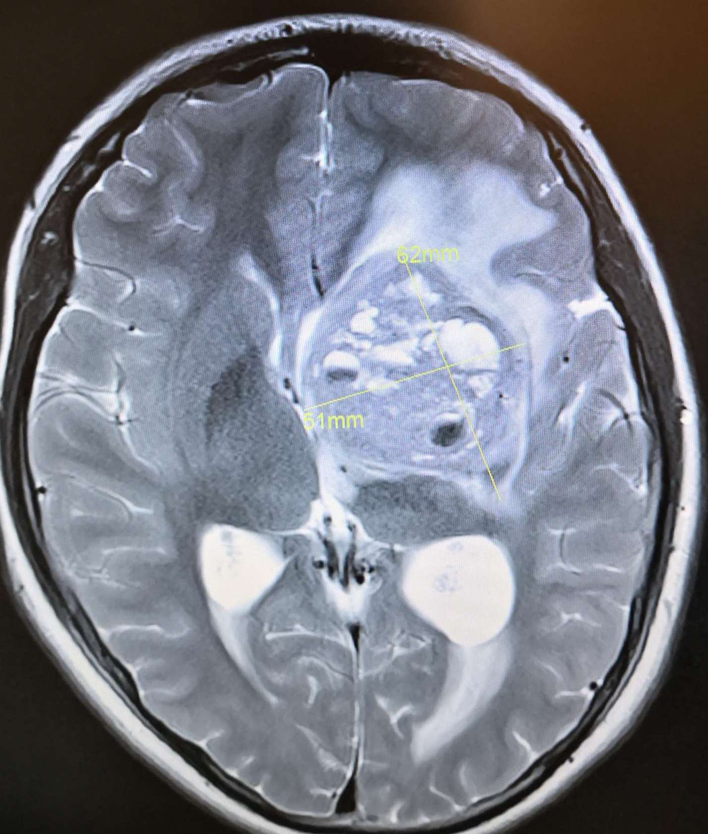 术前头颅MRI T2显示:左侧基底节巨大占位病灶(61*62mm),呈高、等、低混杂信号,脑室受压,中线移位明显。