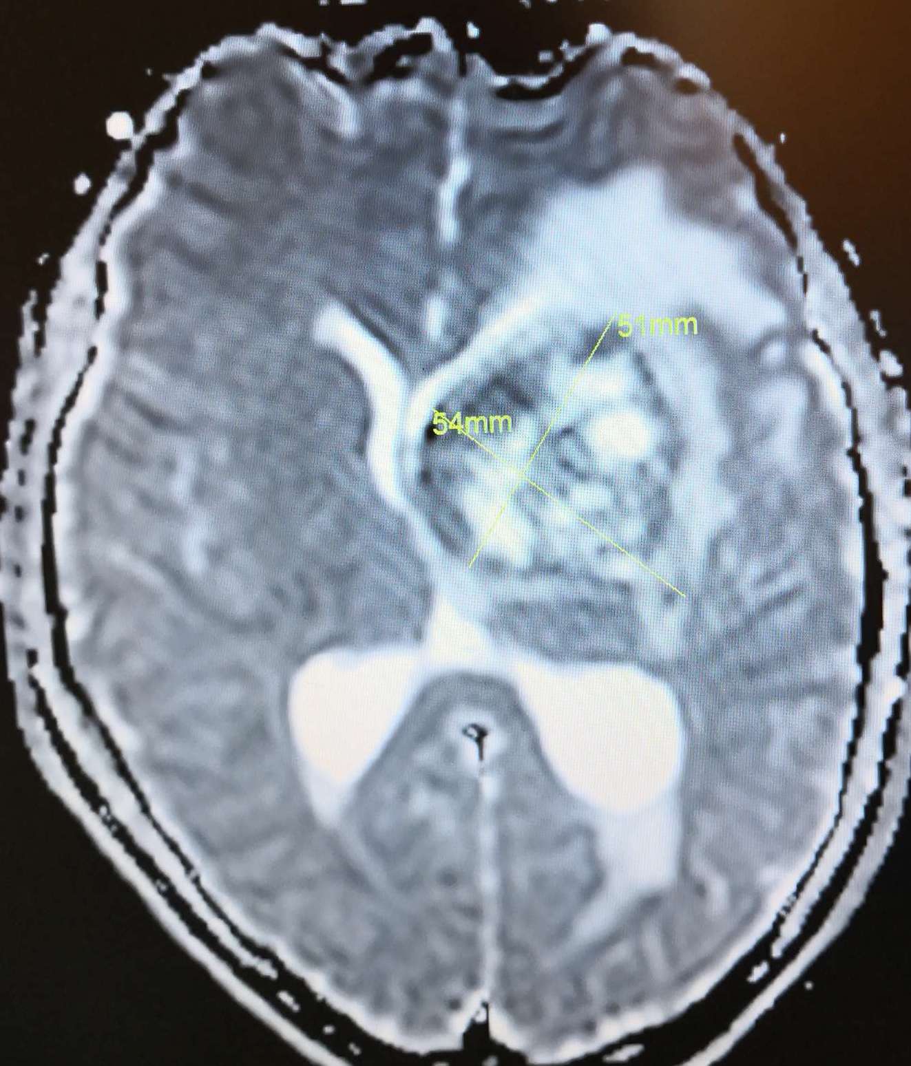 术前头颅MRI ADC显示:左侧基底节巨大占位病灶(51*54mm),呈高、低值,脑室受压,中线移位明显。