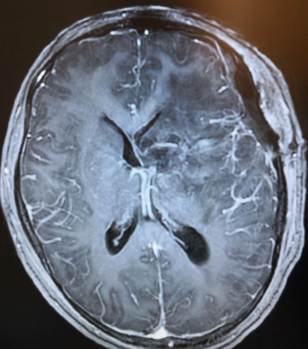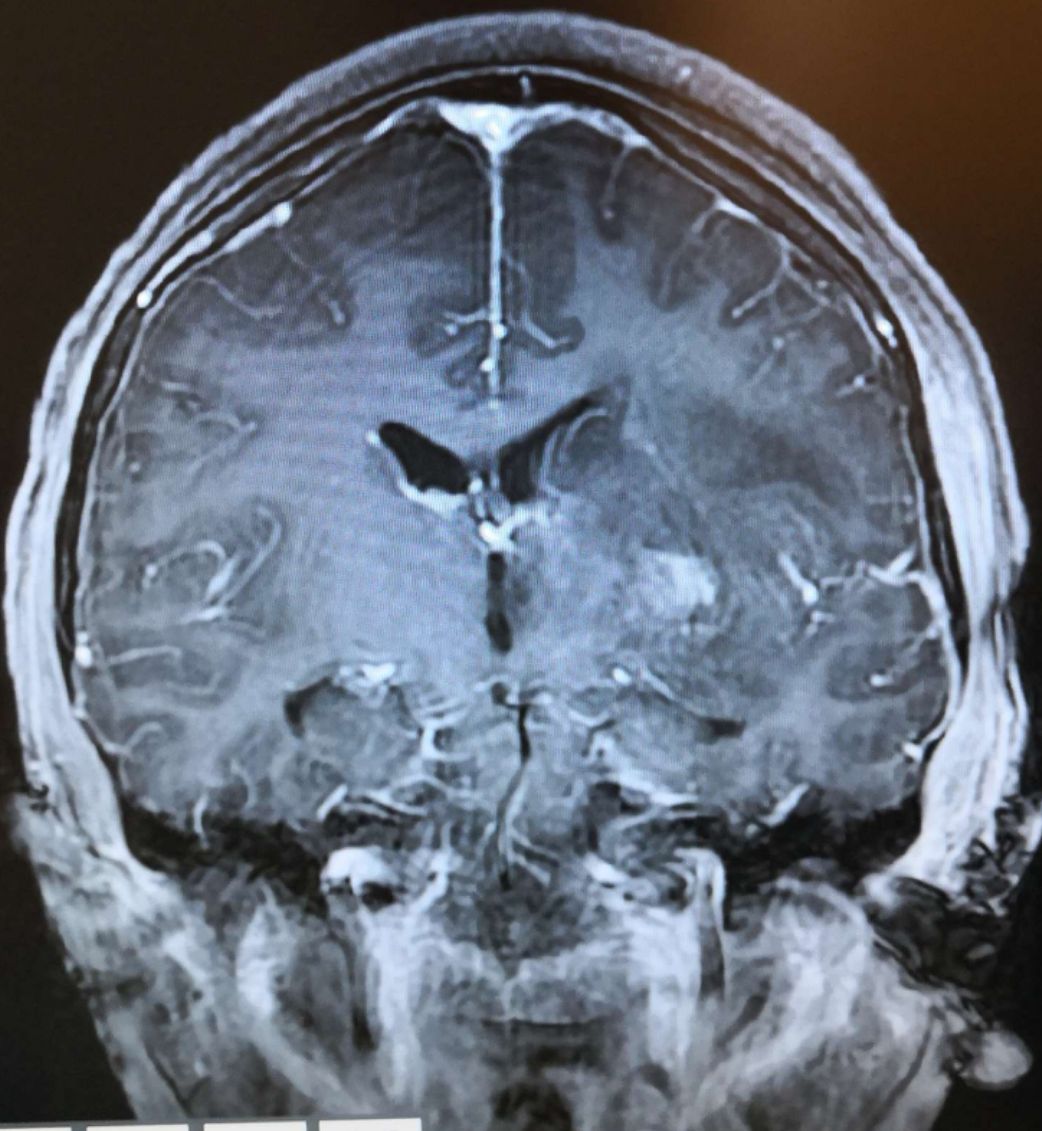 术后头颅MRI增强显示:左侧基底节未见强化病灶,中线居中,脑室轻度受压。