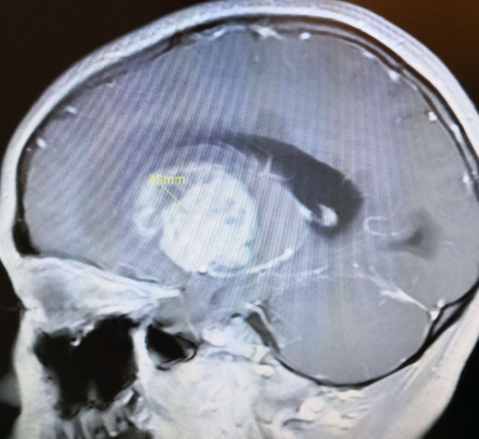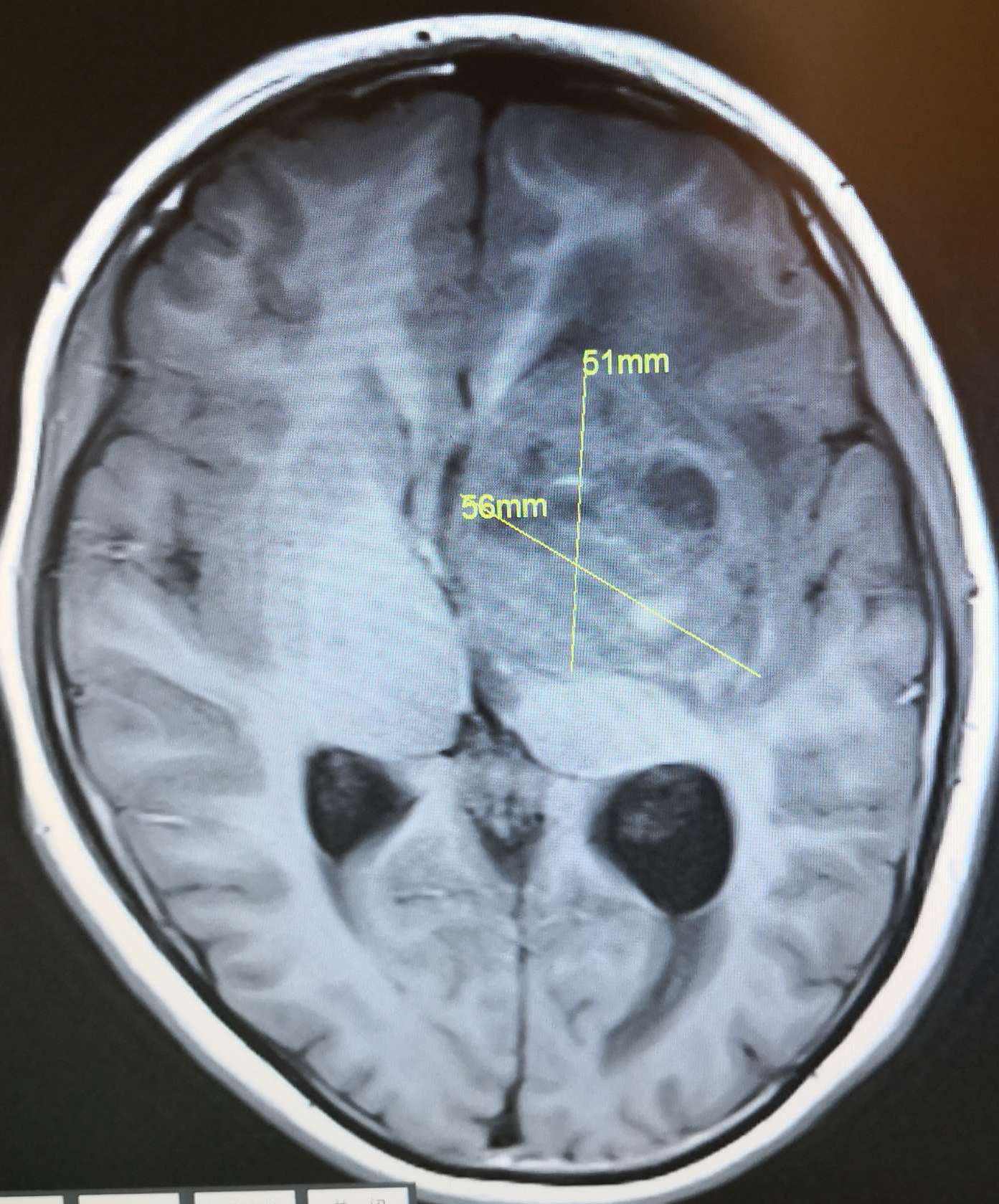 术前头颅MRI T1显示:左侧基底节巨大占位病灶(56*51mm),呈高、低、等混杂信号,脑室受压,中线移位明显。