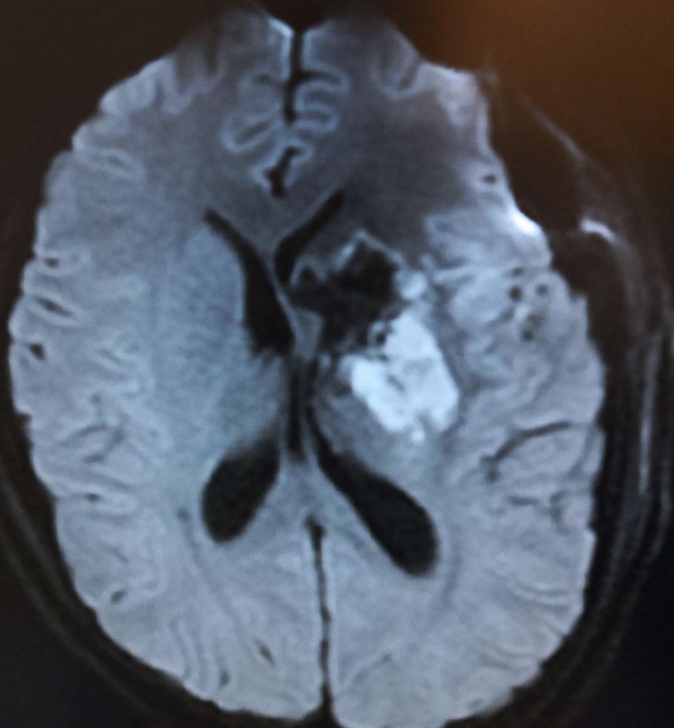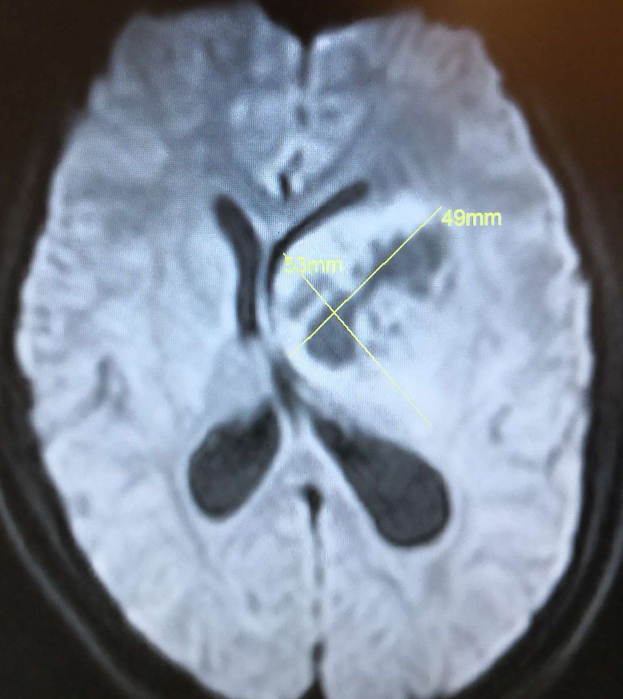 术前头颅MRI DWI显示:左侧基底节巨大占位病灶(49*53mm),呈高、低信号,脑室受压,中线移位明显。