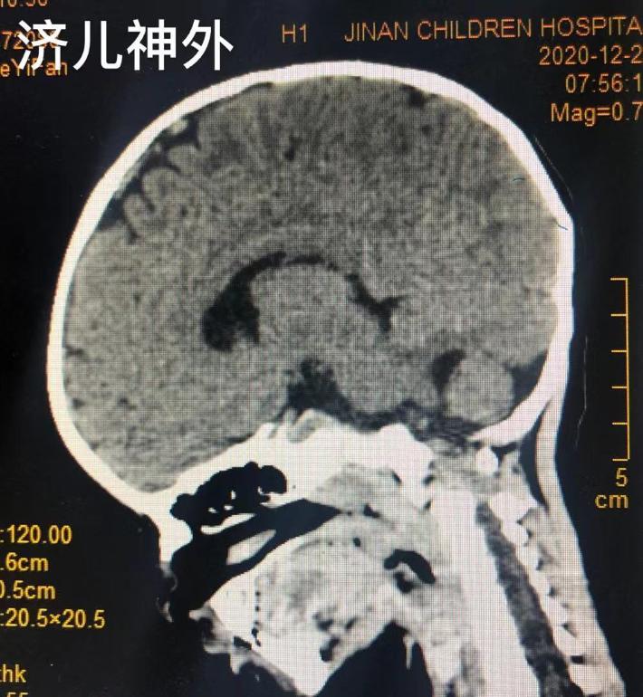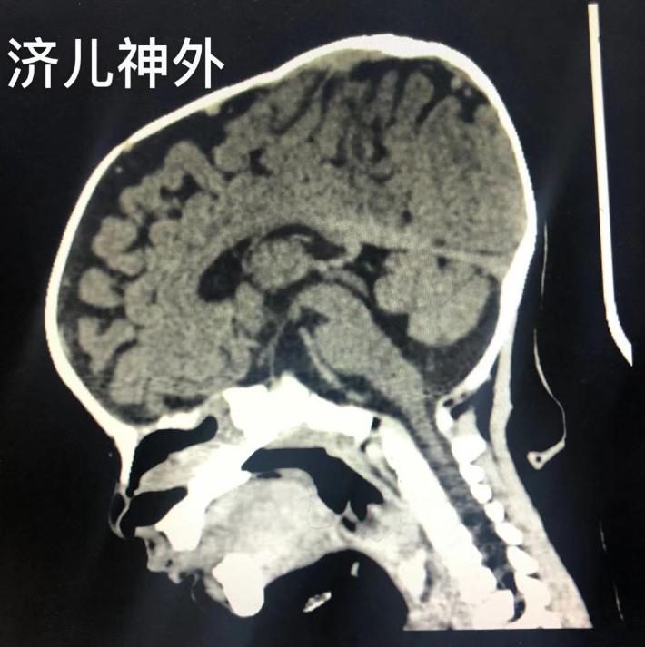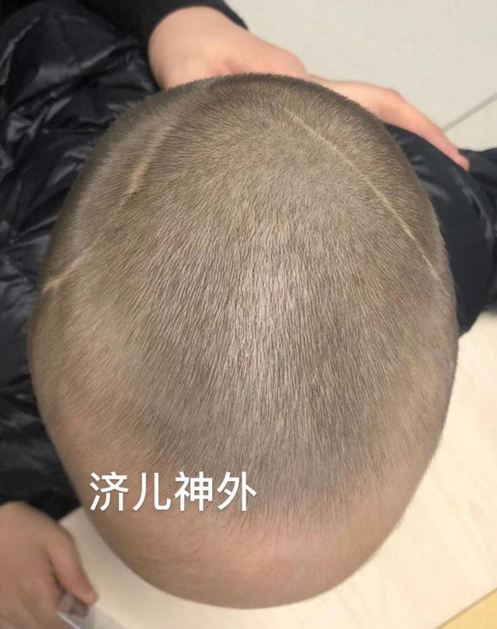 1岁2月,男婴,狭颅症的病例。单一颅缝早闭,矢状缝早闭(又称长头畸形,或舟状头)。