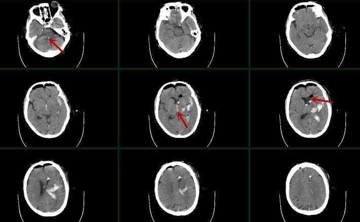 查体:体温:36.7℃,脉搏:71次/分,呼吸:21次/分钟,血压:150mmHg/76mmHg。GCS评分8分,神志浅昏迷。双侧瞳孔等大等圆,直径1.5mm,对光反射灵敏。右上肢肌力1级,右下肢肌力2级,肌张力均减低,左侧上下肢肌力5级,肌张力正常。右侧Barbinski征(+)。