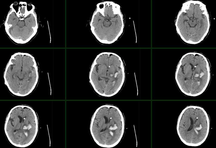 辅助检查:头颅CT(2020-11-10):左侧基底节区脑出血并破入丘脑及脑室系统。