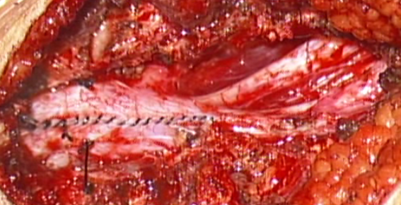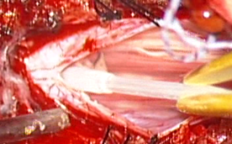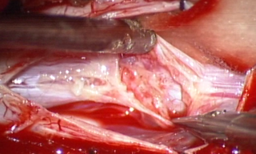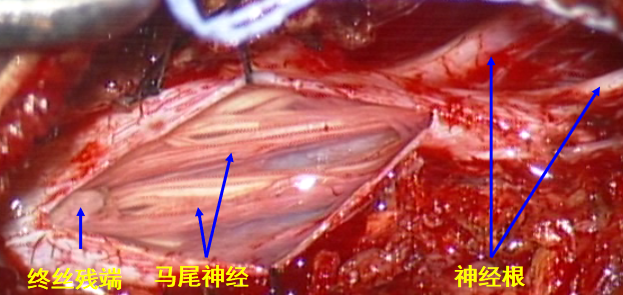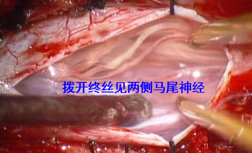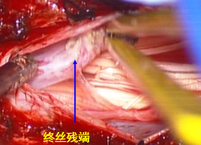 存在脊髓栓系,终丝剪断部位尽量接近硬膜囊末端,多数情况下有马尾神经附着,需翻转终丝,多角度仔细观察剥离,防止误伤。