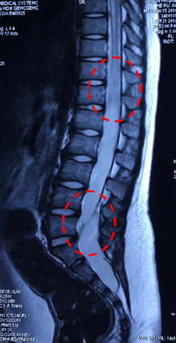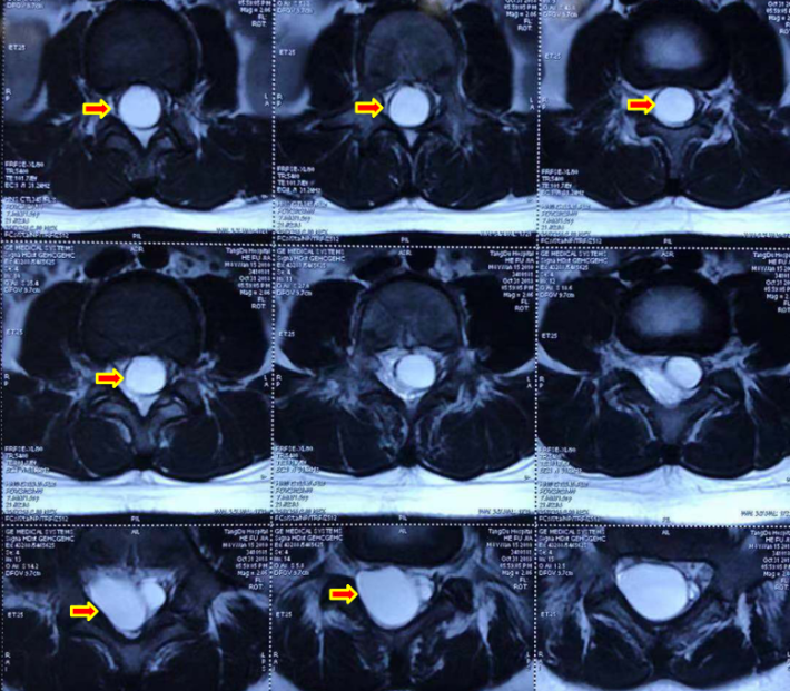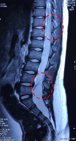 男,8岁大小便失禁伴双下肢肌力下降25天小便失禁为突出症状诊断:骶管囊肿、脊髓圆锥中央管扩张?表皮样囊肿?