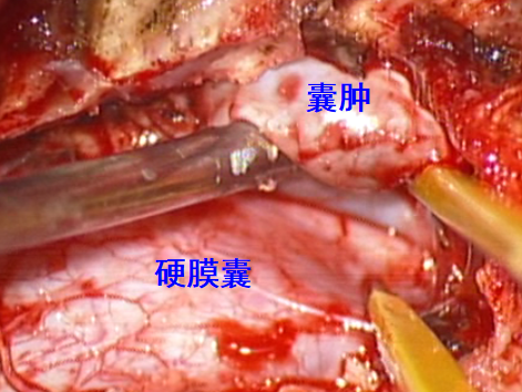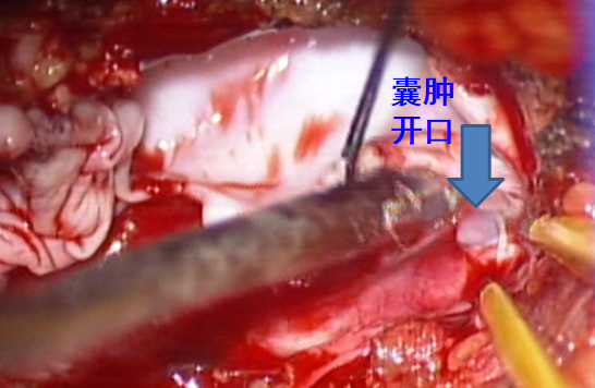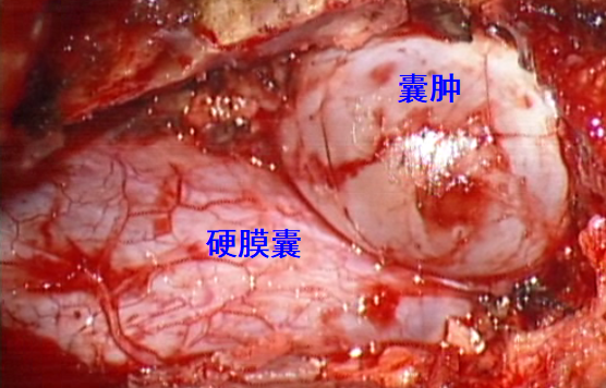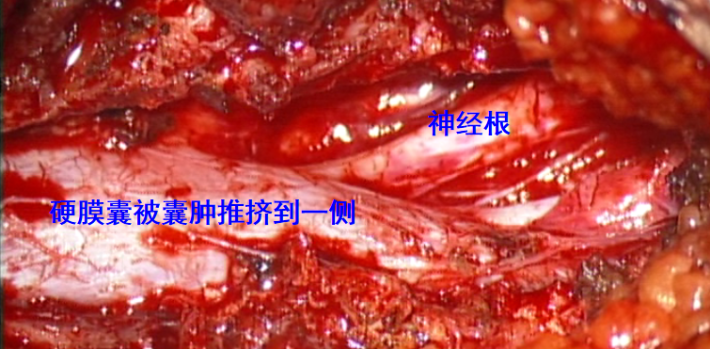 合并骶管囊肿,囊肿内无神经根,囊肿处理关键为封闭硬膜囊漏口,而非单纯填充肌肉或脂肪组织,更非引流。