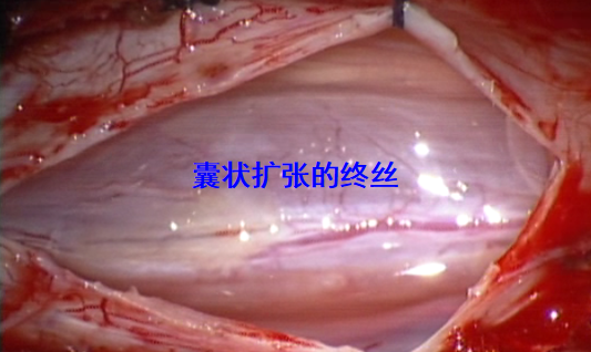 本例脊髓圆锥及终丝呈囊性扩张,术中探查未见表皮样囊肿成分