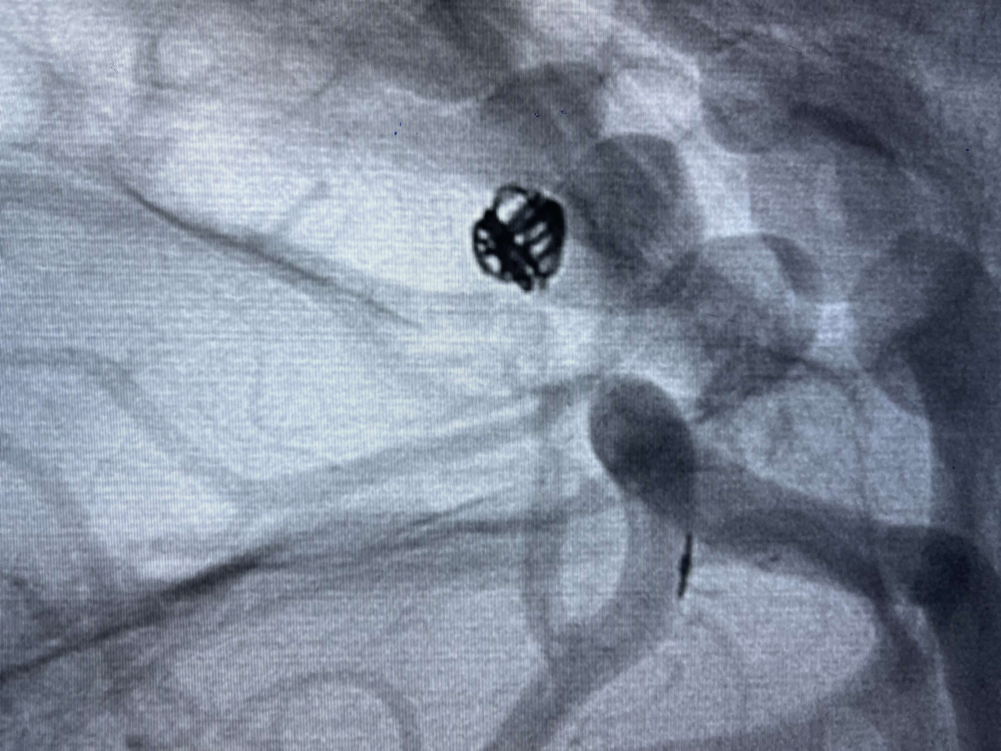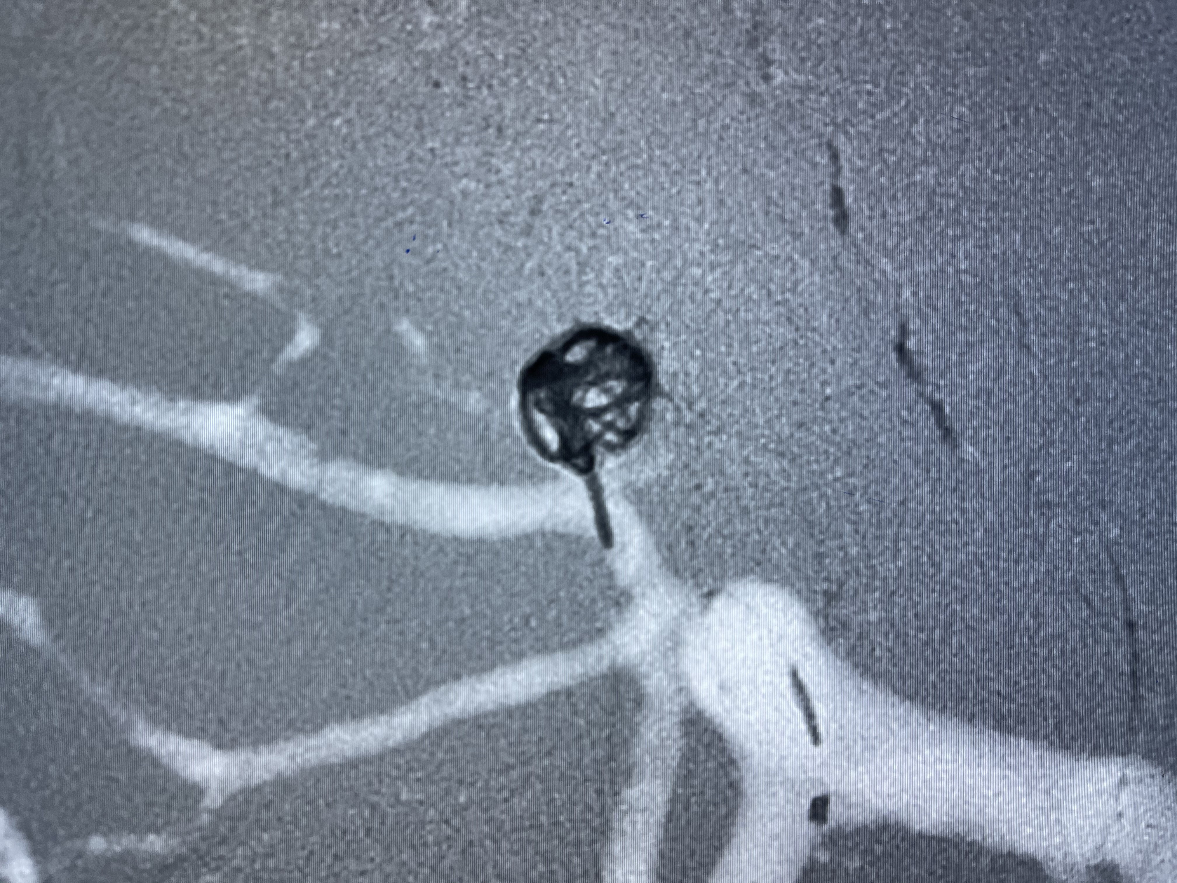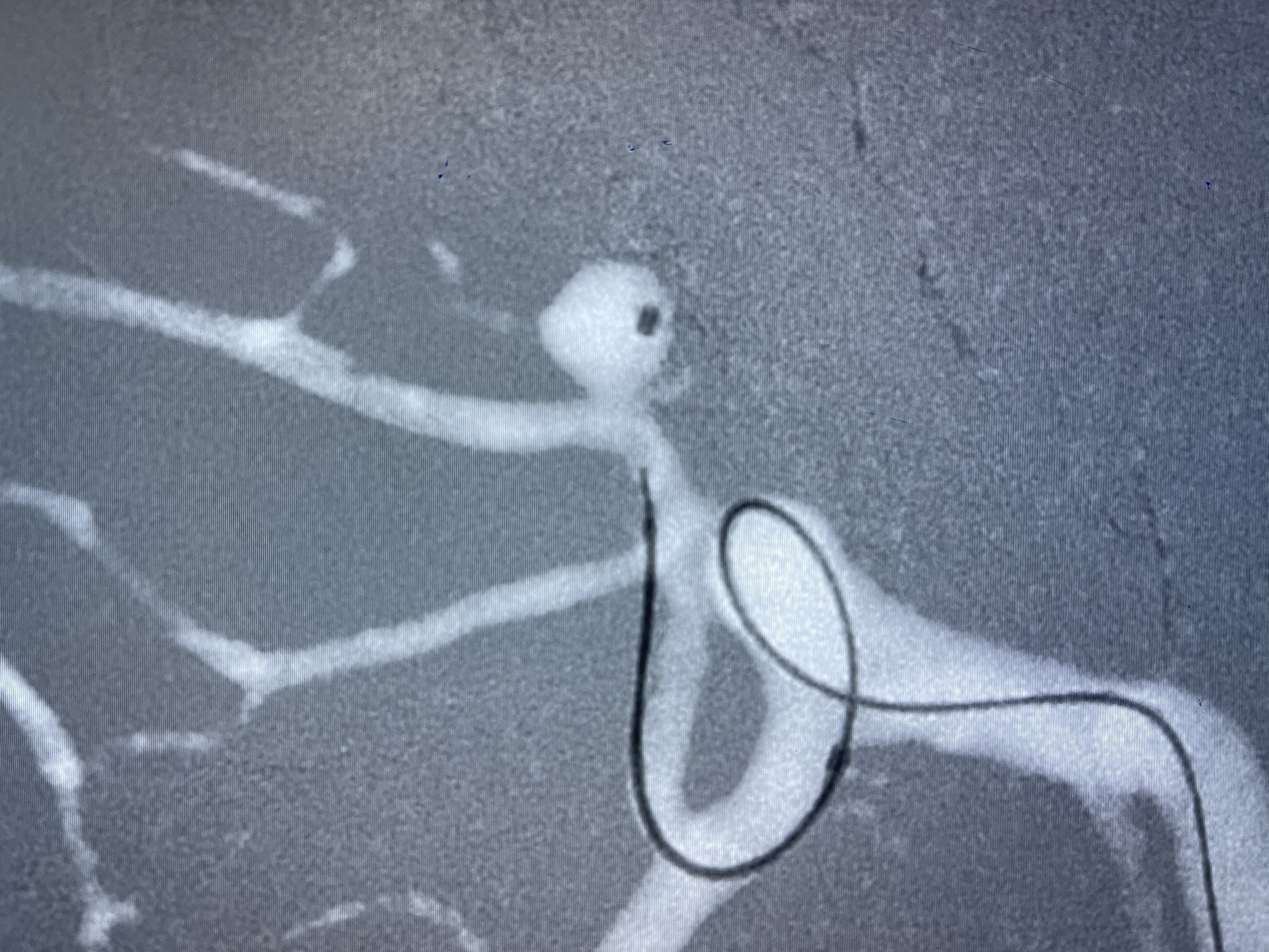 微弹簧圈尾端弹出动脉瘤,栓塞微导管轻轻送入动脉瘤内