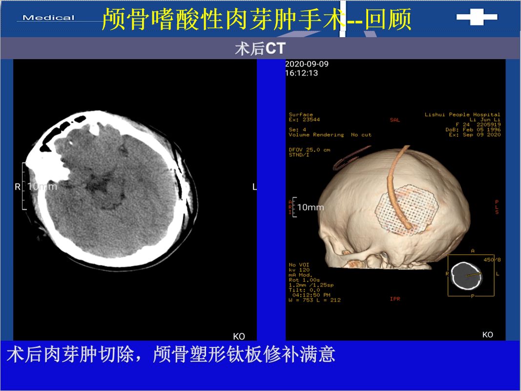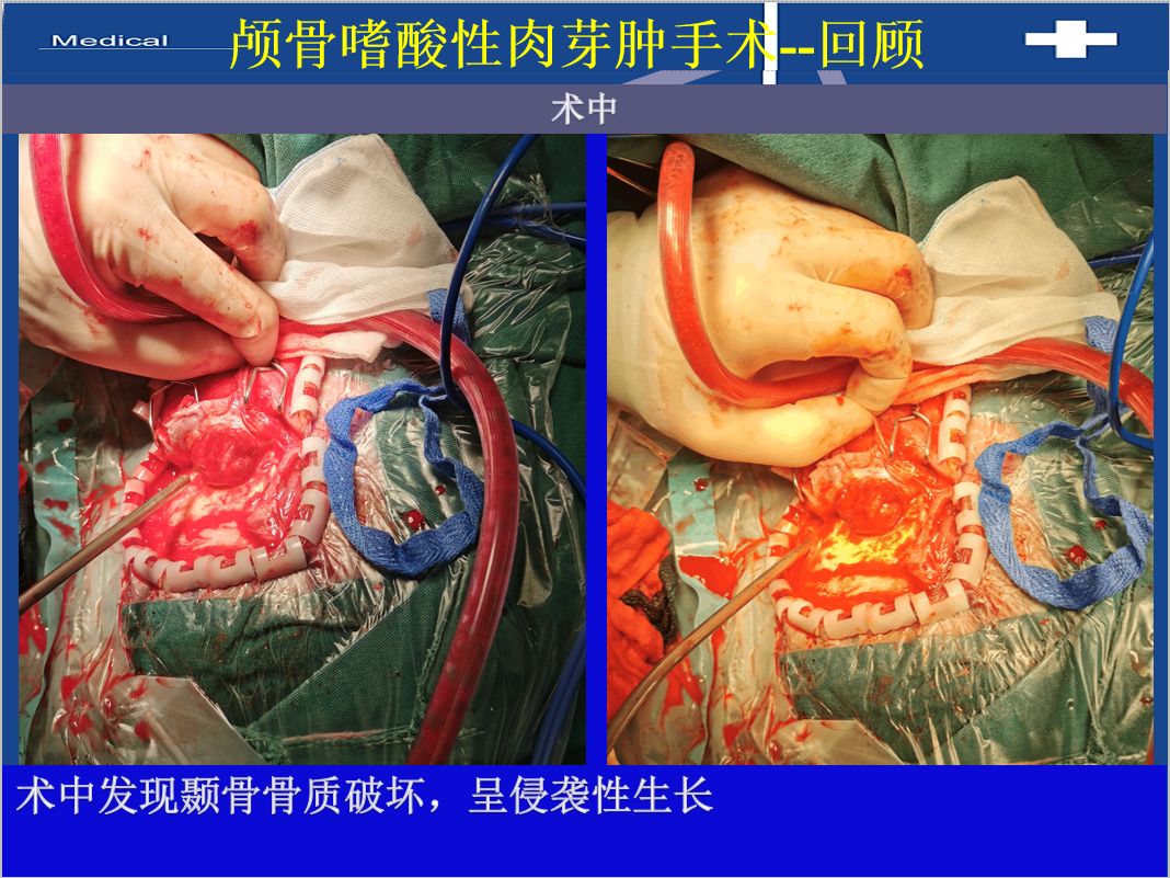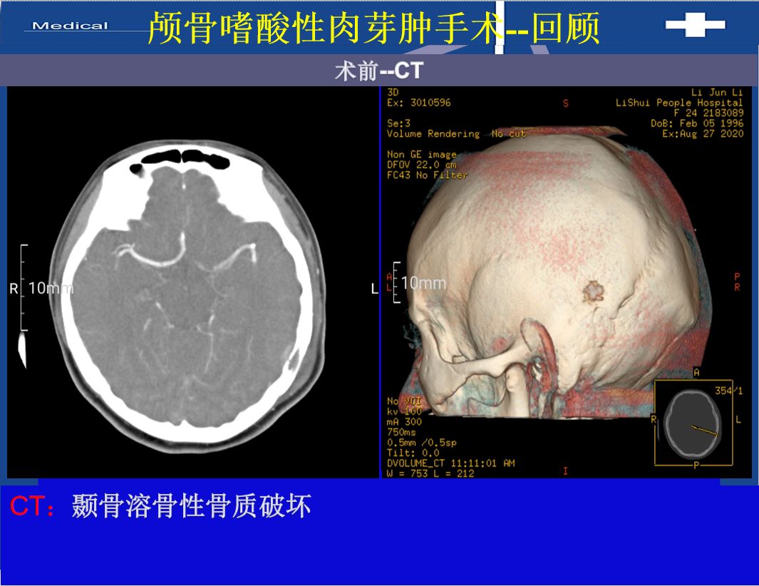 患者基本情况病史患者女 24岁,发现耳后包块伴部疼痛2月入院。间断口服止疼药物。查体及辅助检查神志清醒,右侧耳后可及局部包块,活动度差,双侧肢体肌力V级,病理征(-)。头颅CT:左侧颞骨溶骨性骨质破坏,考虑嗜酸细胞性肉芽肿可能。MRI:左侧颞骨占位,考虑嗜酸性肉芽肿。