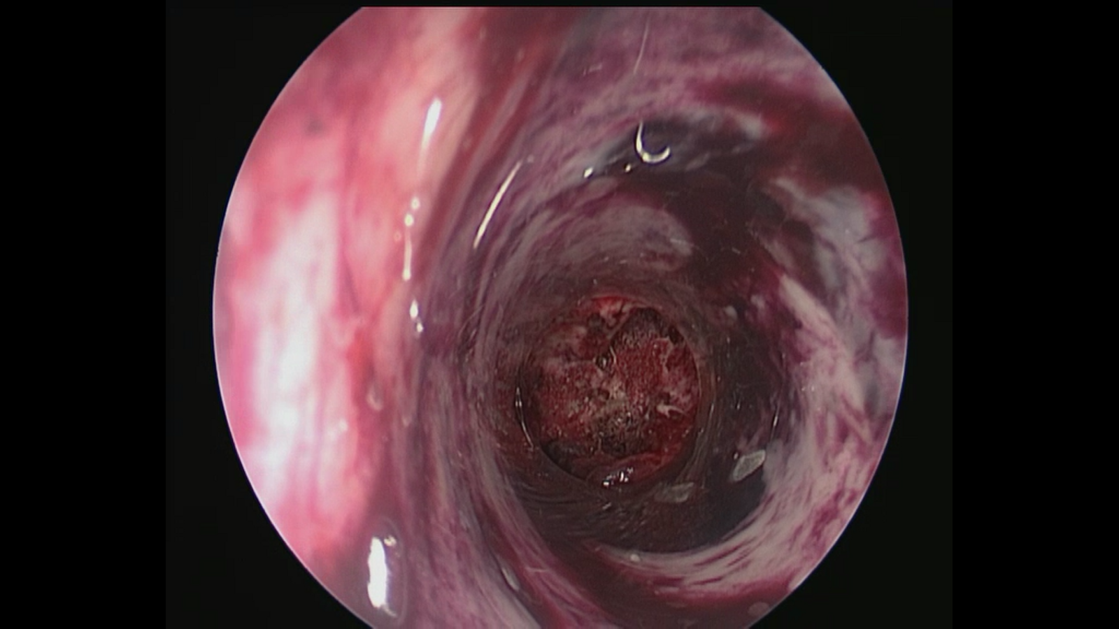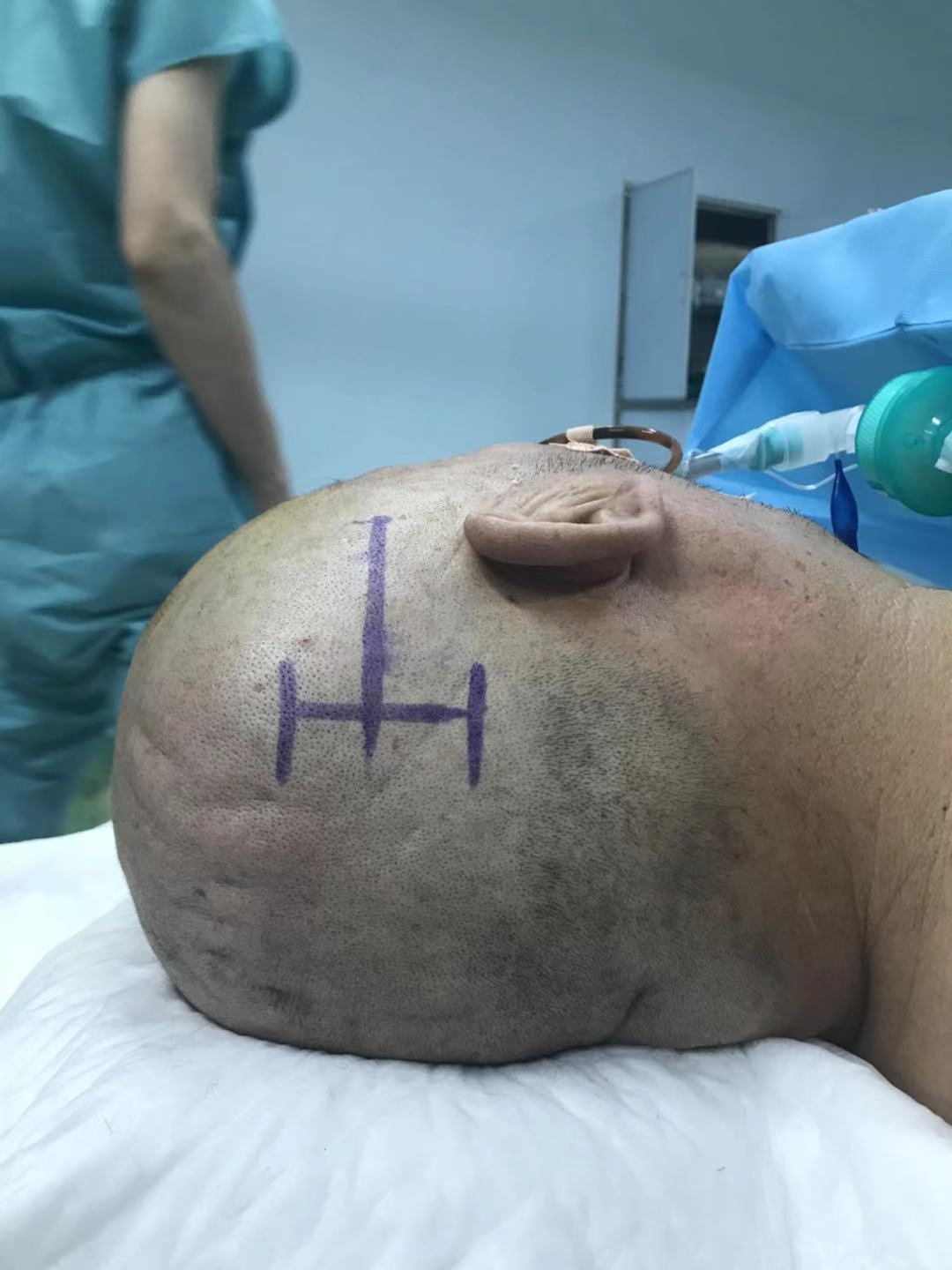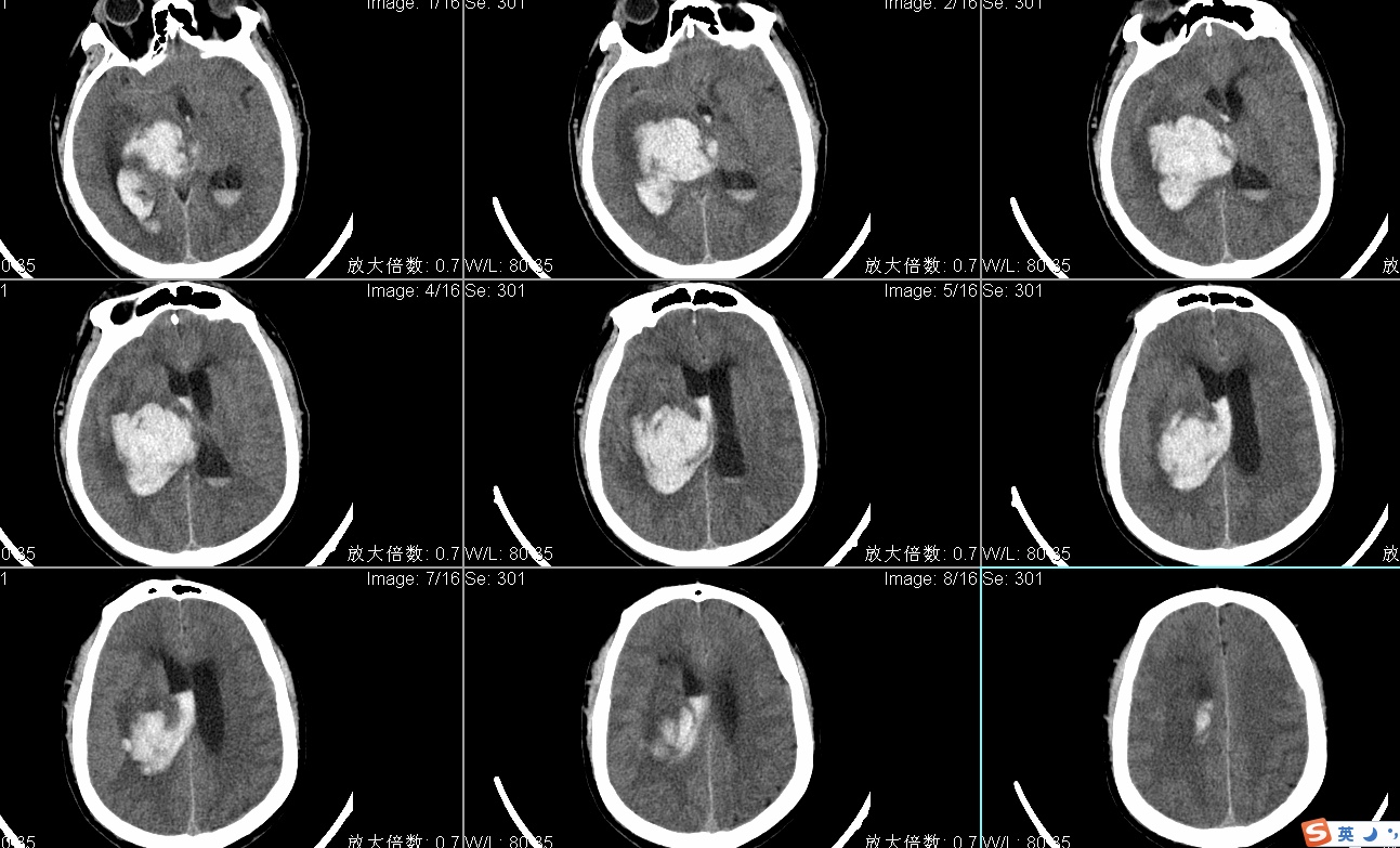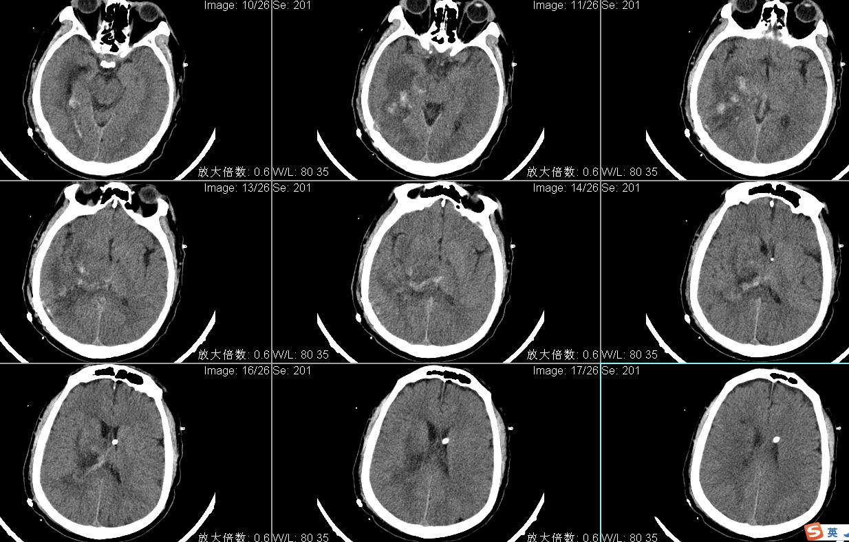 病史:男性,47岁,主因意识不清2小时余入院;查体:T:39.4℃ P:125次/分 R:18次/分 BP:275/165mmHg 昏迷,刺痛不睁眼,不发声,右上肢稍屈曲,双侧瞳孔直径左:右=2.5:3mm,光反射稍迟钝,双眼左侧凝视,颈软,四肢肌力检查不合作,肌张力增高,双巴氏征(+);头CT显示右侧丘脑出血破入脑室多田公式计算出血量约50ml;手术入路:神经内镜辅助右丘脑出血清除术。