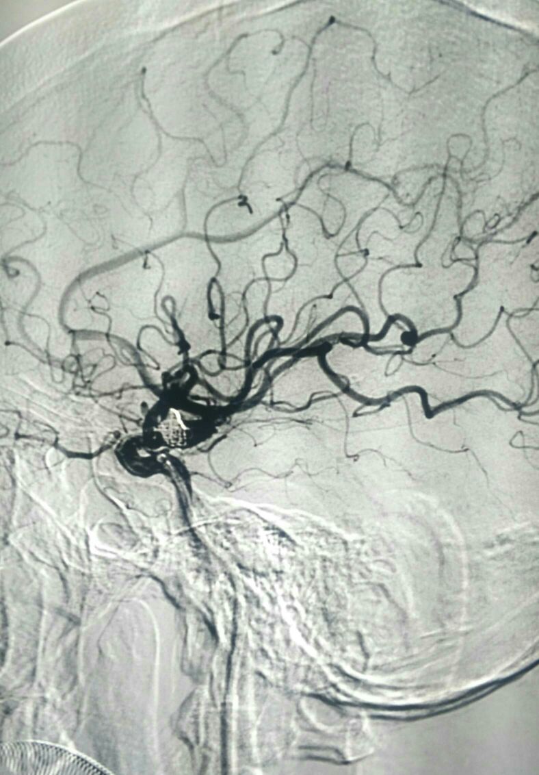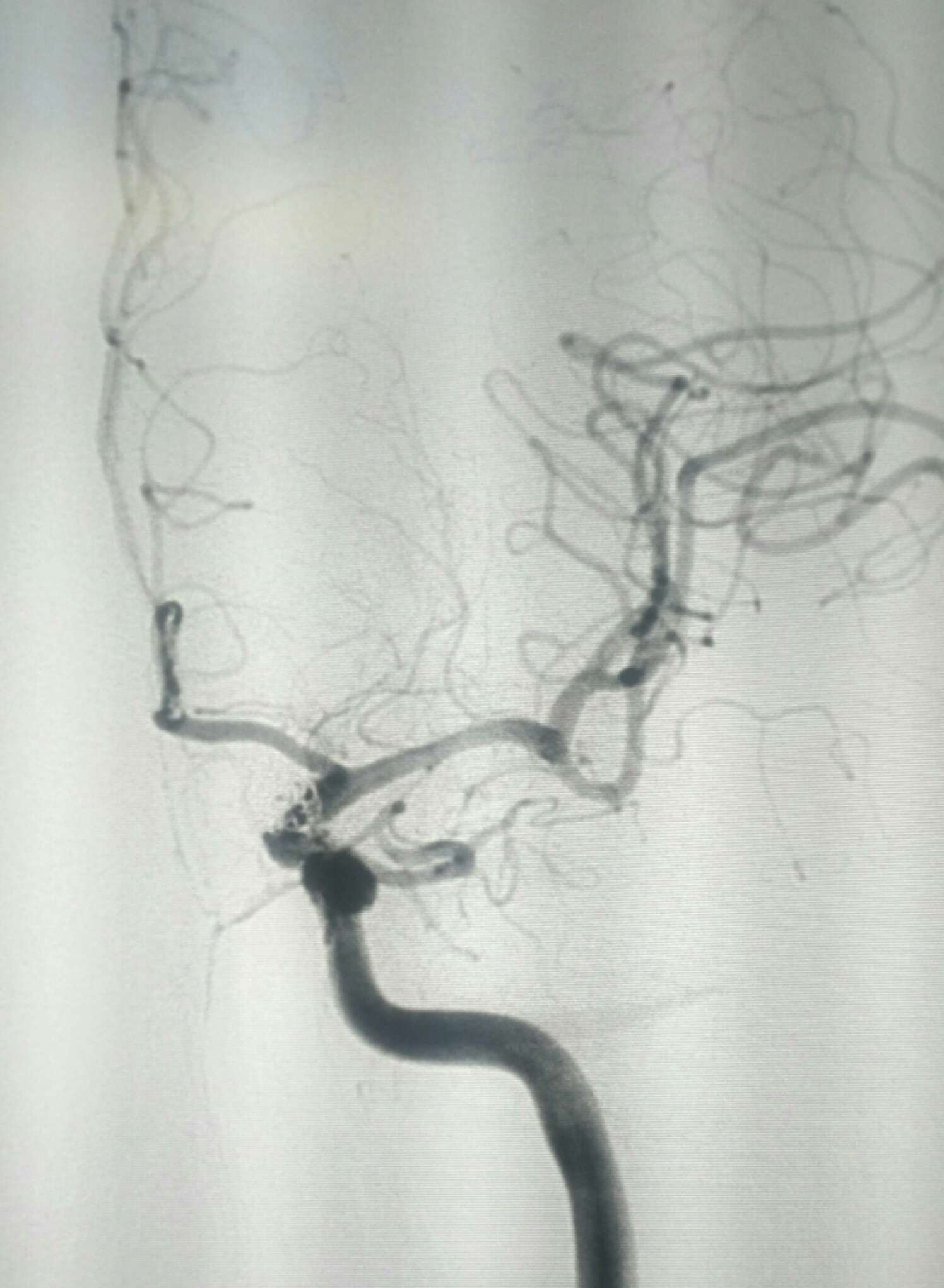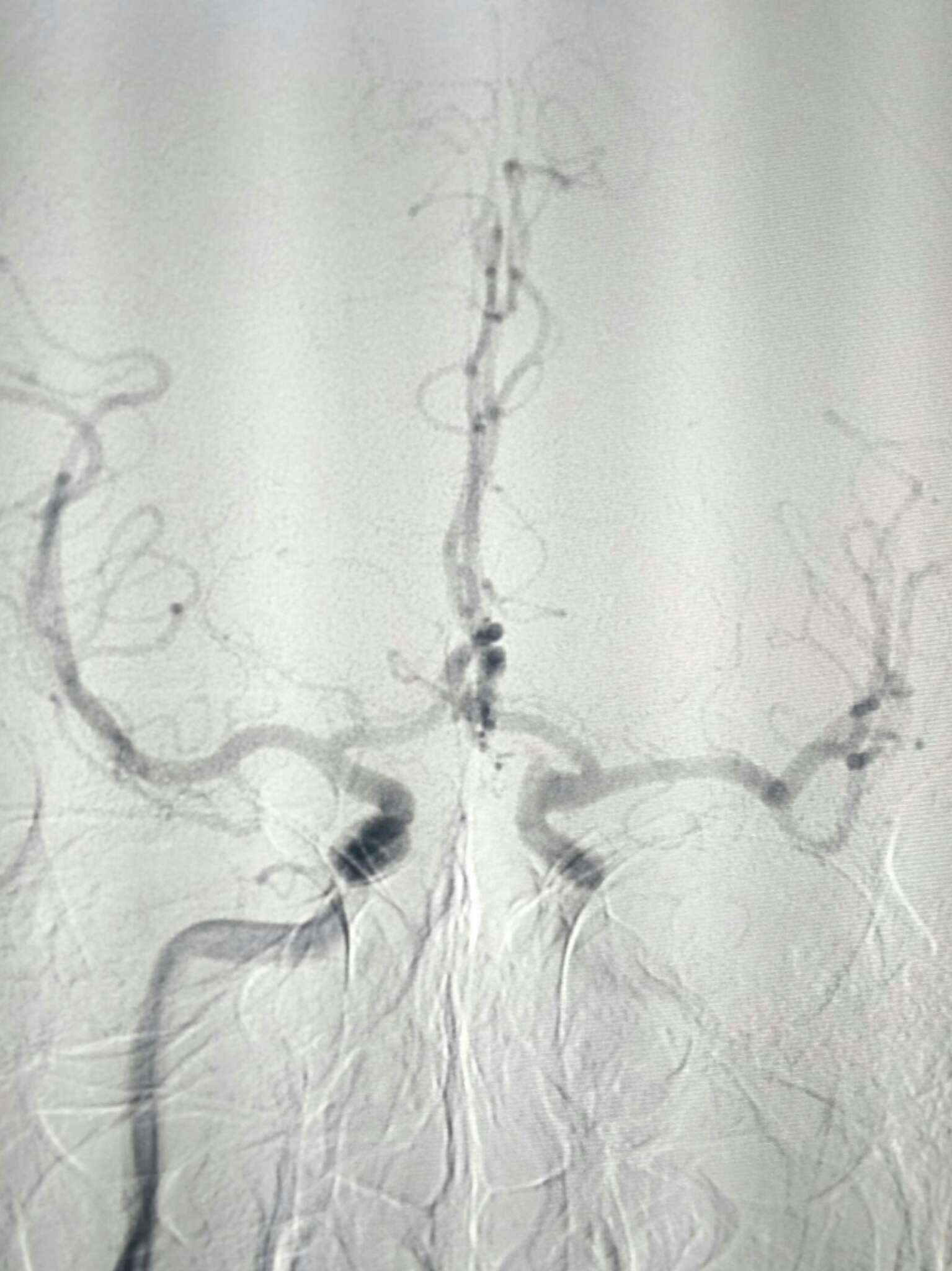 栓塞术前做过右侧颈动脉代偿试验见左侧代偿非常好,如果不是血栓波及到大脑中动脉,患者不但可能没有症状,而且局部血管闭塞治愈动脉瘤无复发之虞,真是无心插柳柳成荫啊!可惜全是柳絮👿