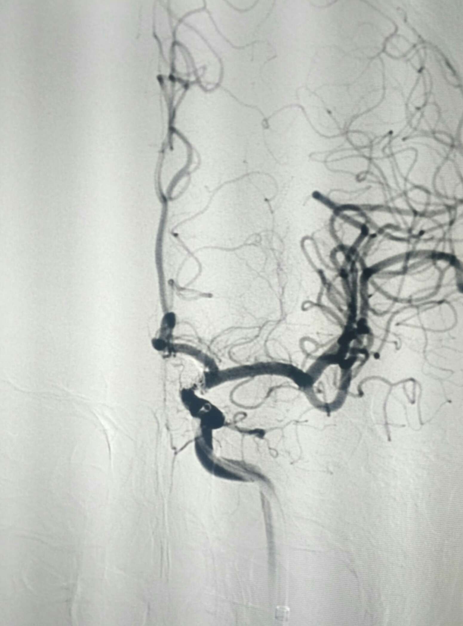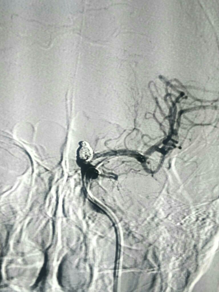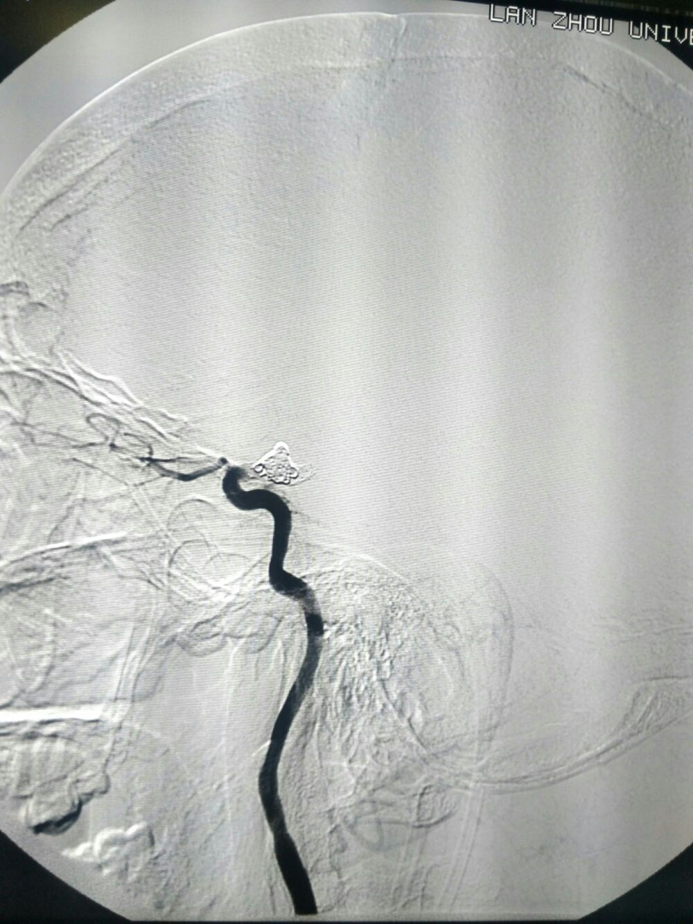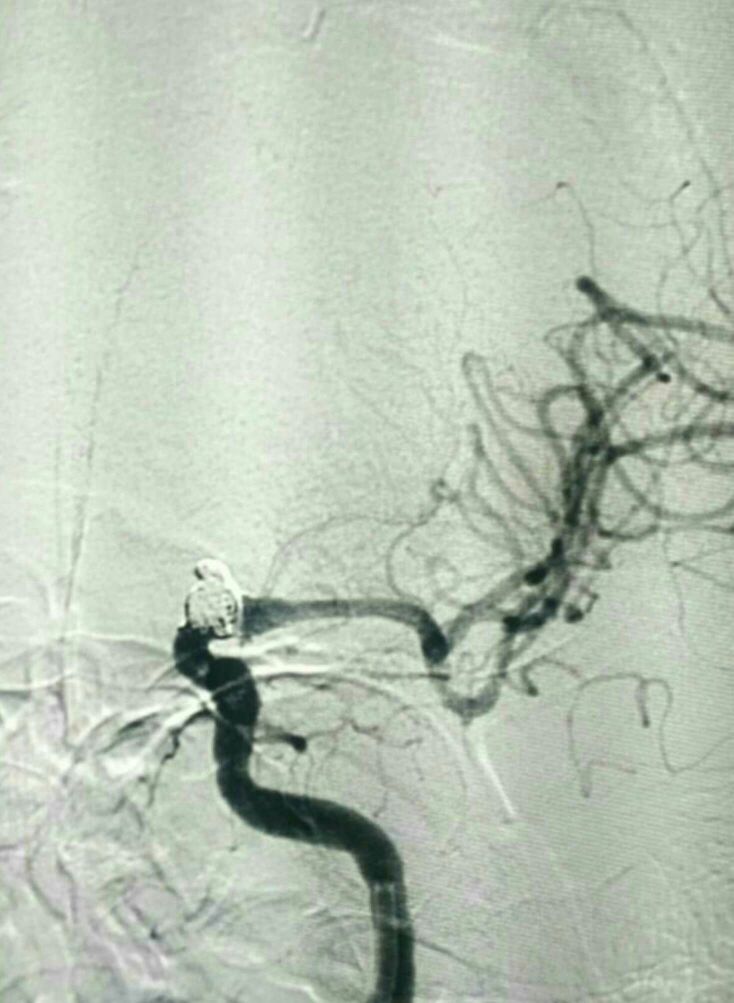 术后20天复查造影动脉瘤栓塞良好无复发显影。目前四肢活动正常,不完全运动性失语,继续康复!