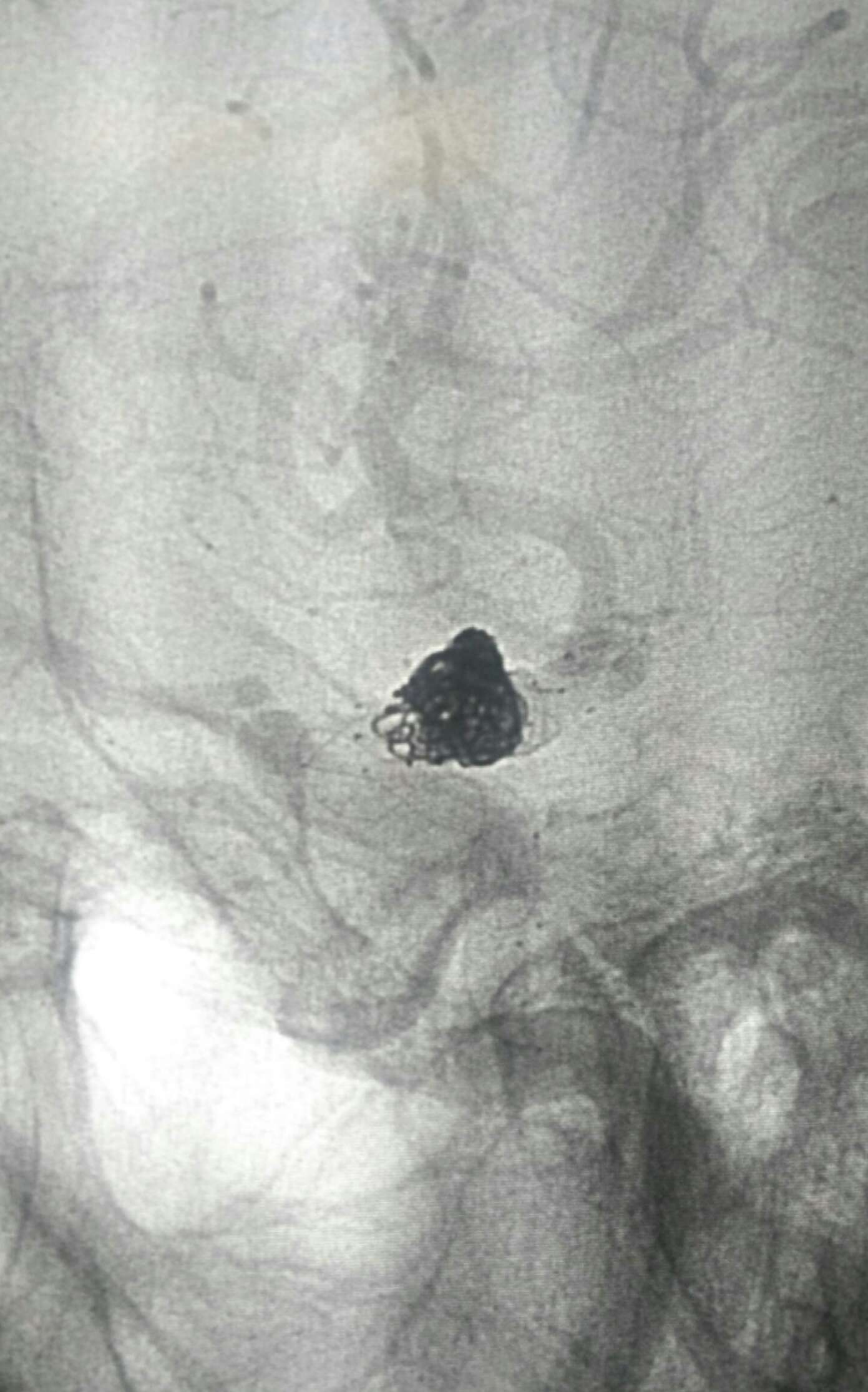 直接接触给4ml欣维宁(前面栓塞时已足量用过)无效,上solitaire6*30支架打开后血管复通但不畅。
