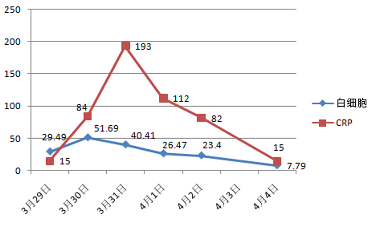 治疗后白细胞计数和C反应蛋白迅速恢复至正常水平!全身炎症反应区域稳定。