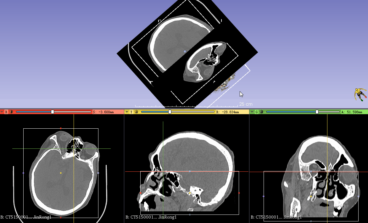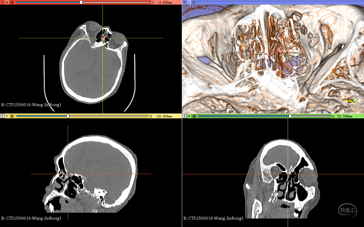 进一步三维CT阅片与重建,导航般了解患者病变位置,患者瘘口位于筛前动脉水平——筛板,嗅凹。