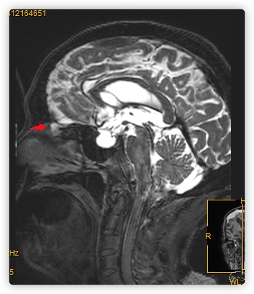进一步头颅MRI检查查找脑脊液漏原因,可见前颅底筛凹处脑脊液漏出。