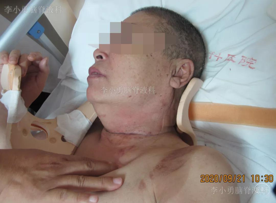 2020年9月1日(即颈椎脑脊液漏修补术后第5天即第二次颈椎病术后第24天)住入脑脊液科治疗。入院时:可见颈部一长约15cm手术切口,缝线未拆,周围肿胀,挤压可见渗液,皮缘浸泡泛白。