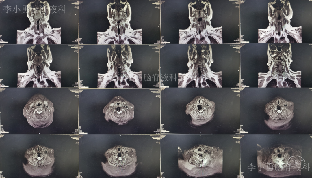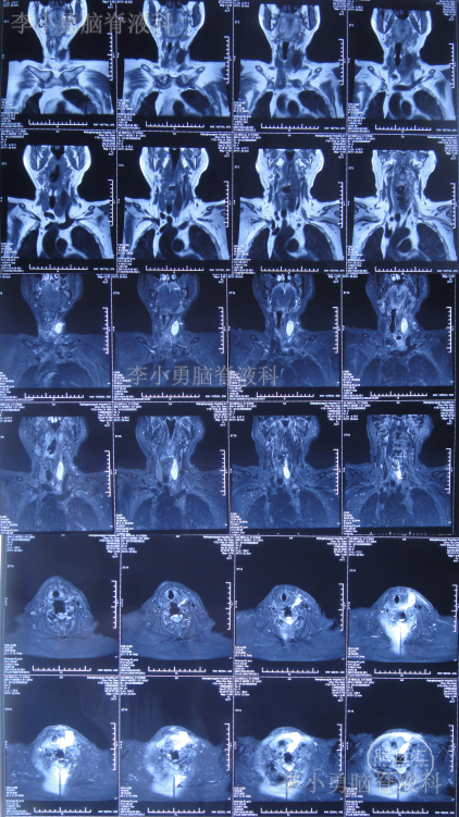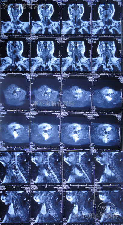 2020年9月2日(入脑脊液科次日,即颈椎脑脊液漏修补术后第6天,即第二次颈椎病术后第25天)复查颈部MR示术区皮下深部仍有包裹性积液(图-10)。