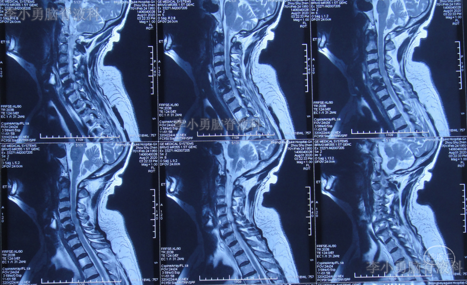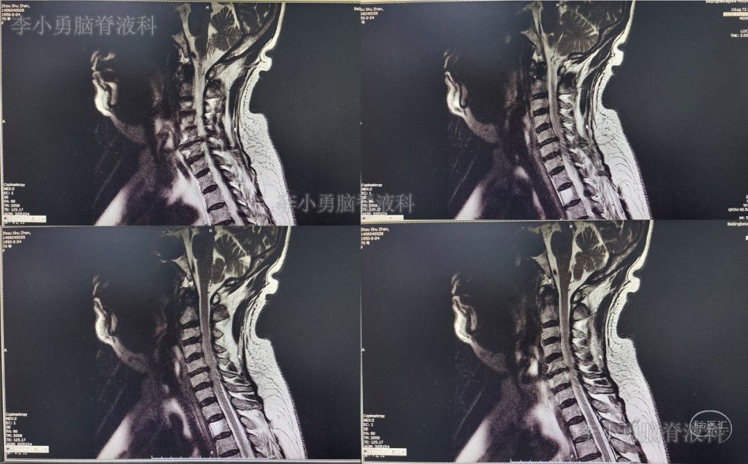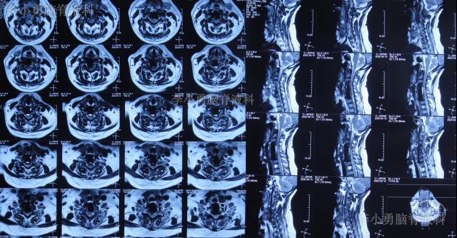 2020年8月1日(即第一次颈椎病术后第101天)患者复查颈椎MR示颈椎病,椎管狭窄,颈髓受压(图-5)。