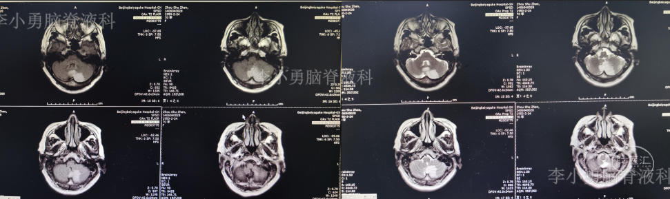 2020年7月14日(即第一次颈椎病术后83天)患者又出现头晕加重,尤以低头扭头时明显(注:患者未按照医嘱佩戴颈托),而且双上肢放射痛,麻木再次出现,双下肢无力,行走不稳,门诊复查头颅MR示小脑陈旧性梗塞(图-4)。