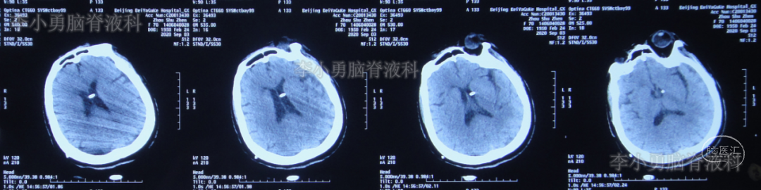于2020年9月3日(入脑脊液科第3天,即颈椎脑脊液漏修补术后第7天即第二次颈椎病术后第25天)行脑室外引流术。术后复查头颅CT:引流管位置良好(图-11)。