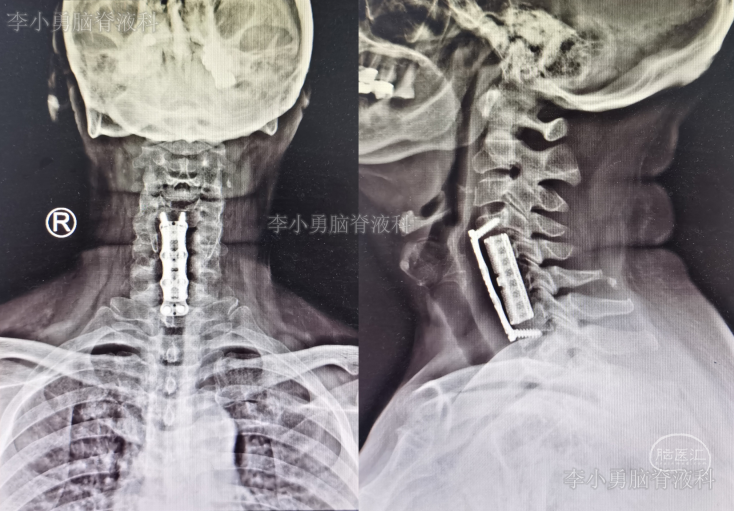 2020年10月20日(入脑脊液科第50天,拔除脑室引流管后第23天,即第二次颈椎病术后第68天)患者颈部伤口愈合良好,但仍有头晕无法独立下地行走,好转出院(图-18)。