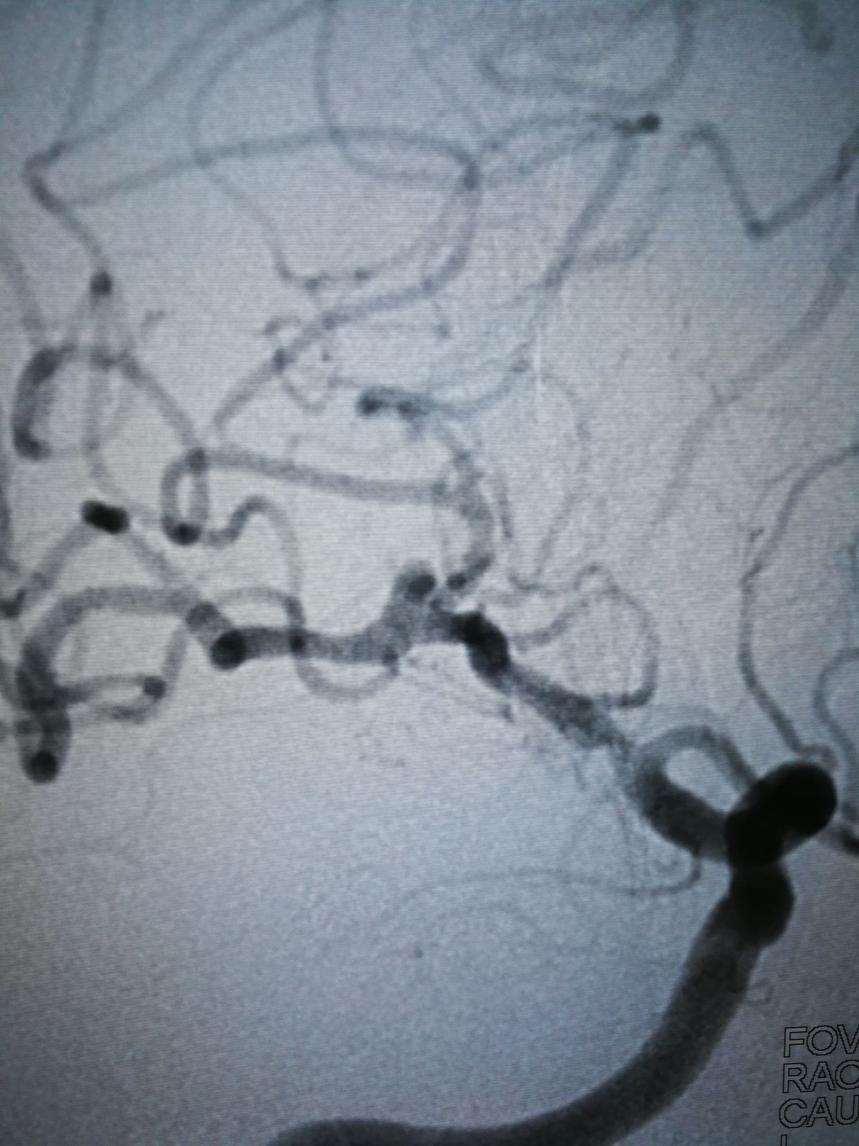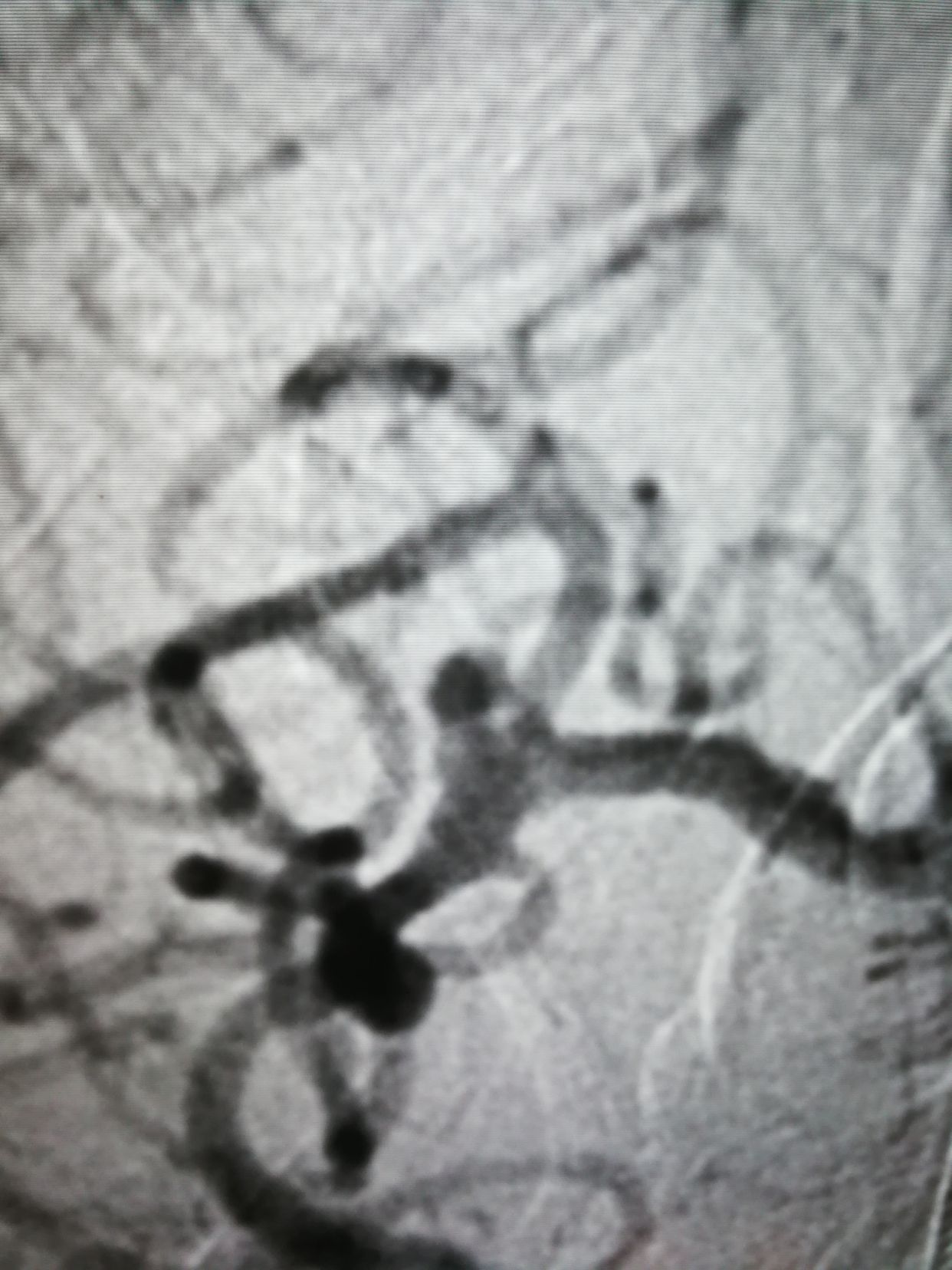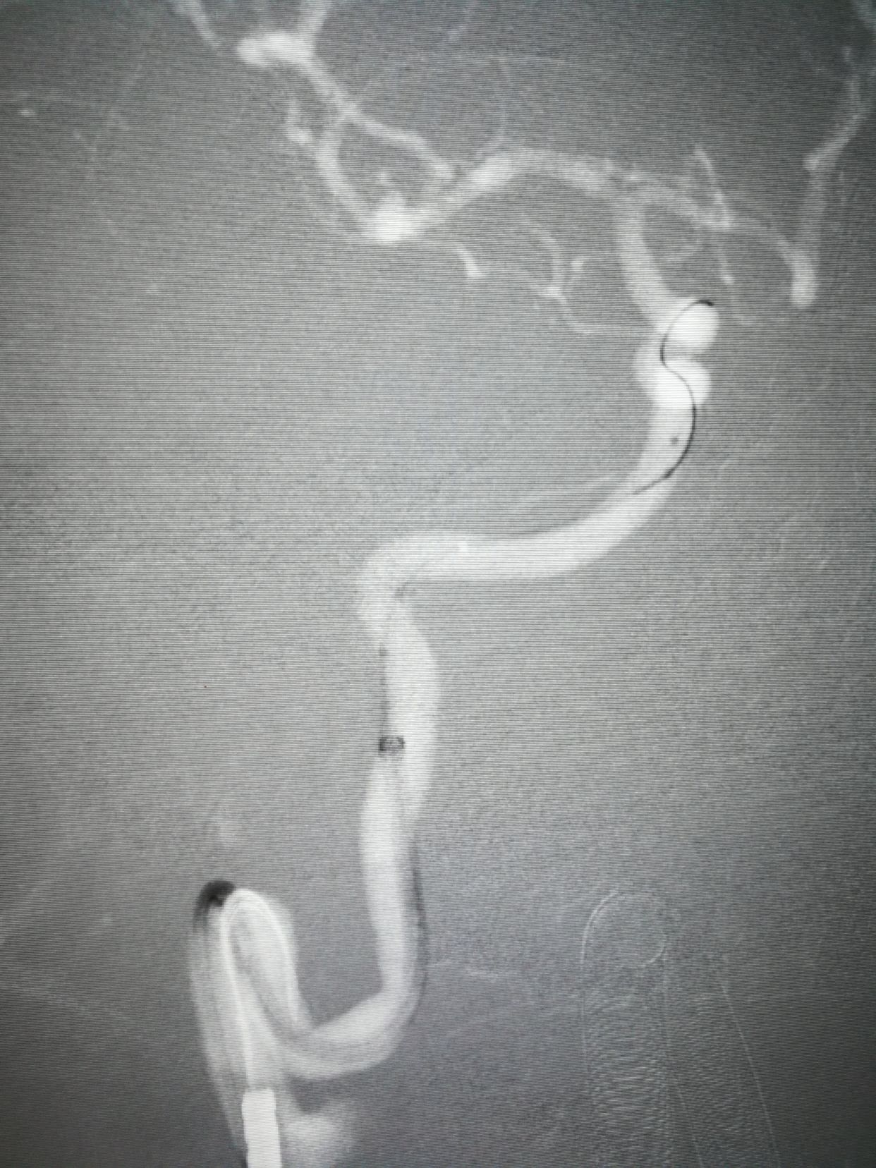 65岁女性,两次破裂出血,运气很好,术前还是清醒的 CTA示右侧大脑中分叉部动脉瘤,瘤子小,颈宽,主要累及下干,颈内动脉预期 术前3d和工作位 6f90cm长鞘,105navien到位。 comos 3-6,hypersoft 1.5-3填塞后,成篮还不错,下干几个袢,支架后释放很放心 lvis25-17,支架打开很好,术后动脉瘤完全不显影。1个半小时结束战斗,收工回家。