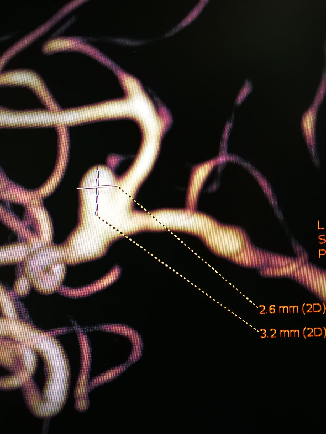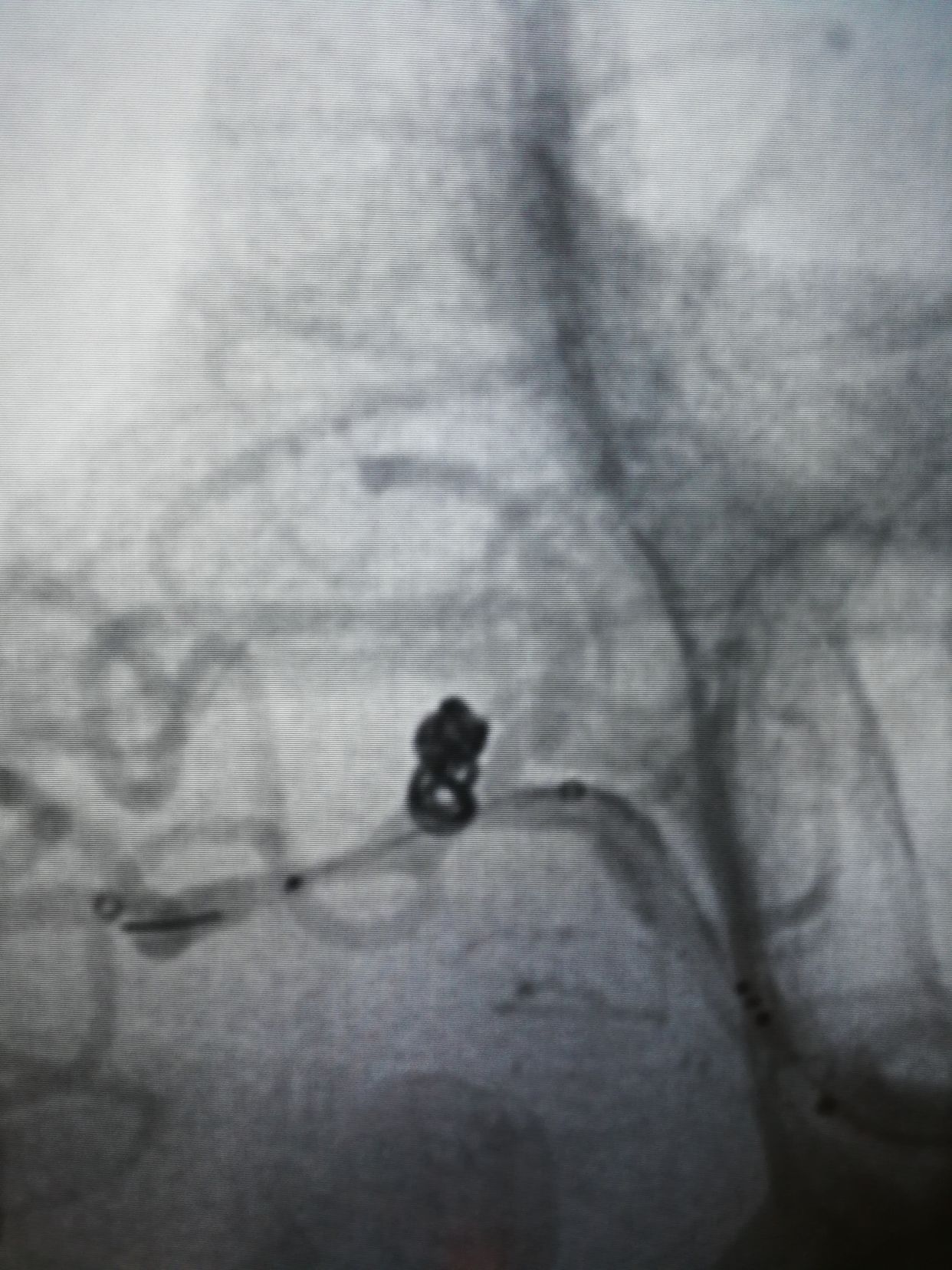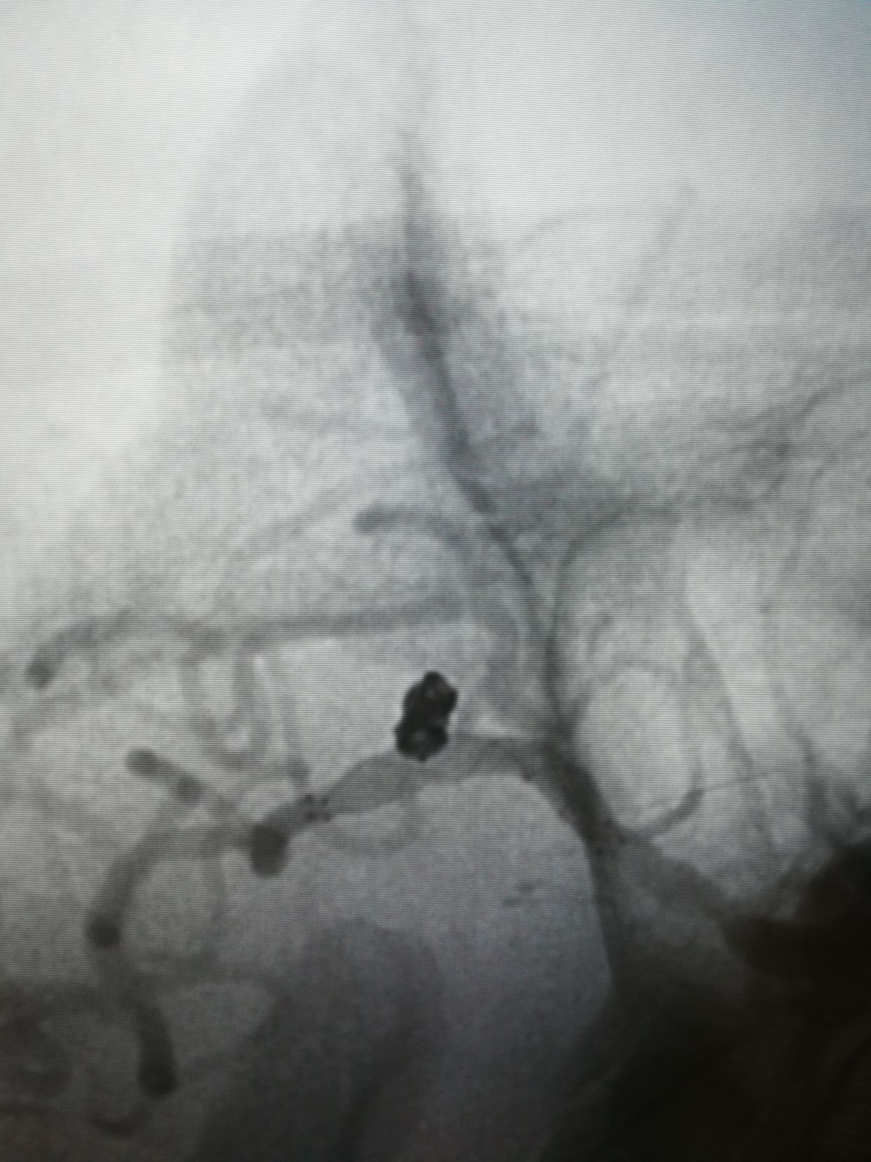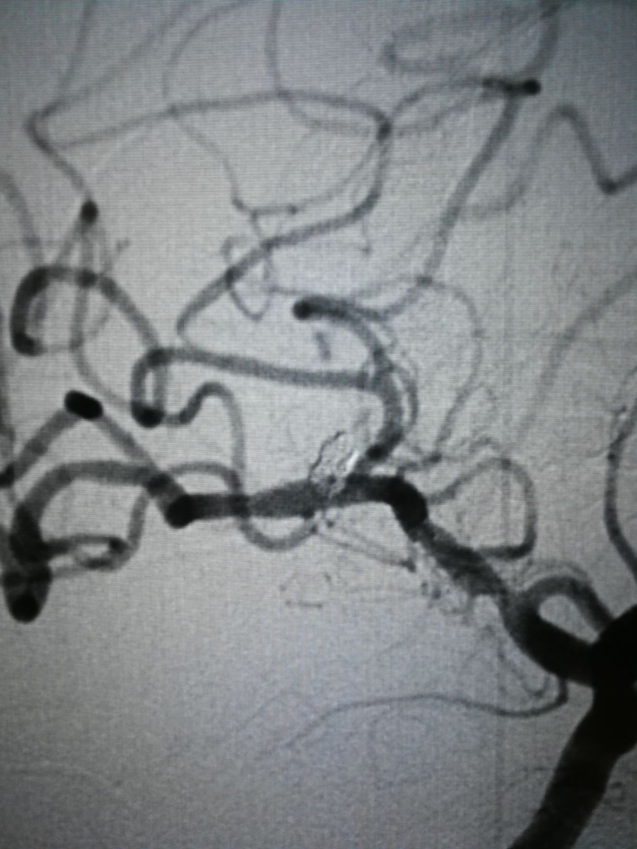 65岁女性,两次破裂出血,运气很好,术前还是清醒的 CTA示右侧大脑中分叉部动脉瘤,瘤子小,颈宽,主要累及下干,颈内动脉预期 术前3d和工作位 6f90cm长鞘,105navien到位。 comos 3-6,hypersoft 1.5-3填塞后,成篮还不错,下干几个袢,支架后释放很放心 lvis25-17,支架打开很好,术后动脉瘤完全不显影。1个半小时结束战斗,收工回家。
