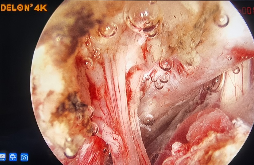 手术采用左侧远外侧入路,使用纯内镜手术,内镜采用国产德龙4K纯高清内镜摄像系统,发现左侧第Ⅸ、第Ⅹ和第Ⅺ颅神经穿过颈静脉孔处肿瘤。