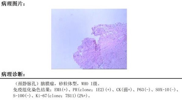 术后患者声音嘶哑较术前有所好转,病理结果显示颈静脉孔区砂粒型脑膜瘤。