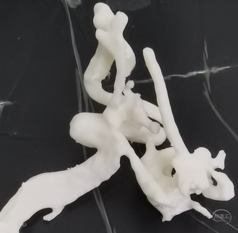 为防止术中损伤颈静脉球和岩下窦导致大出血,3D打印出病变和周围血管形态。可见病变紧贴岩下窦汇入颈静脉球部。