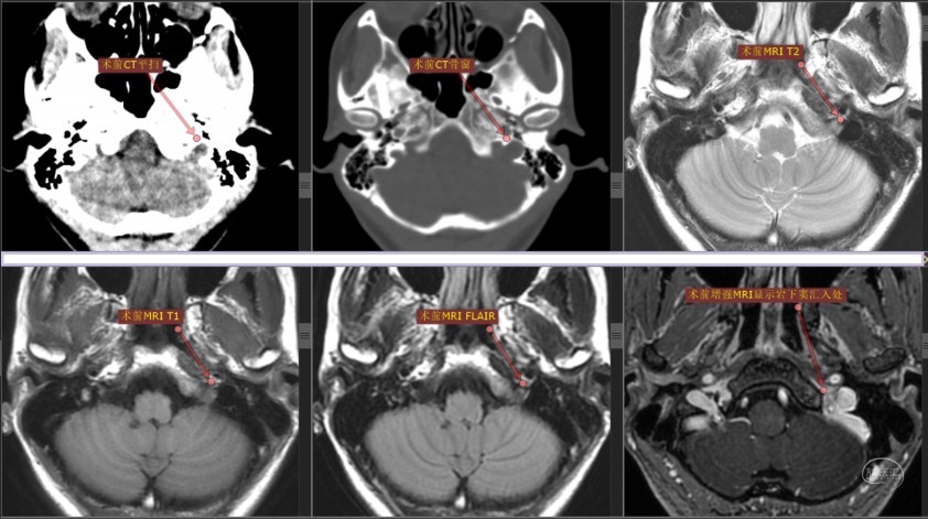 根据患者症状和体征,排除肺部病变,考虑病变定位于左侧颈静脉孔区导致左侧第Ⅹ和第Ⅺ颅神经同时受累。尽管磁共振报告“阴性”,但我们从术前CT和磁共振影像上仔细观察,还是能发现一些蛛丝马迹:CT显示左侧颈静脉孔较对侧略扩大,磁共振增强扫描显示左侧岩下窦汇入颈静脉孔处有不均匀增强信号。