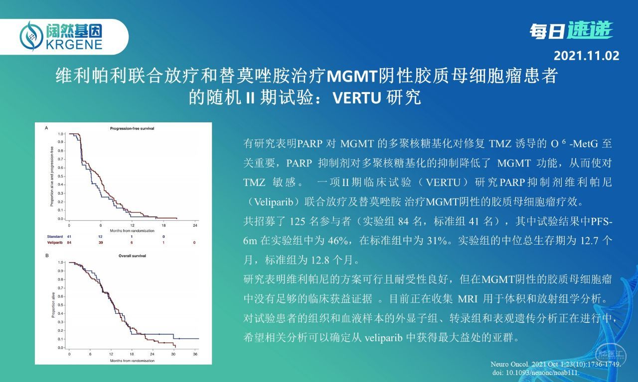 有研究表明PARP 对 MGMT 的多聚核糖基化对修复 TMZ 诱导的 O 6 -MetG 至关重要,PARP 抑制剂对多聚核糖基化的抑制降低了 MGMT 功能,从而使对 TMZ 敏感。 一项II期临床试验(VERTU)研究PARP抑制剂维利帕尼(Veliparib)联合放疗及替莫唑胺 治疗MGMT阴性的胶质母细胞瘤疗效。研究表明维利帕尼的方案可行且耐受性良好,但在MGMT阴性的胶质母细胞瘤中没有足够的临床获益证据 。目前正在收集 MRI 用于体积和放射组学分析。对试验患者的组织和血液样本的外显子组、转录组和表观遗传分析正在进行中,希望相关分析可以确定从 veliparib 中获得最大益处的亚群。
