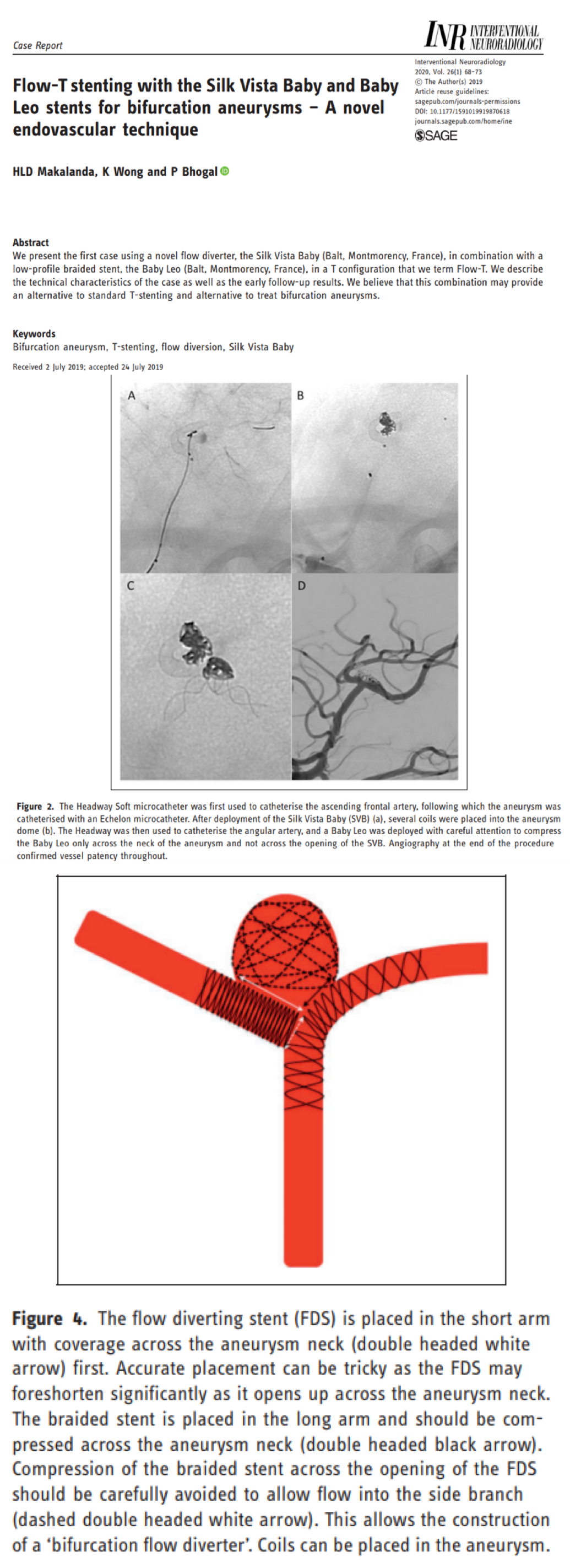 后记:关于血流导向装置联合T形支架技术(Flow-T stenting)治疗基底动脉尖动脉瘤,目前尚无文献报道,但Flow-T stenting这项技术的发明和命名不是我们的原创(详见下图),但我们在术前确实没有关注到这篇个案报道,只是后来编辑这篇病例,再次复习T stent相关文献时发现了它。我们的想法是借鉴了普通T形支架技术,文献多有报道,我们团队在多年的临床实践中也已熟练掌握了这项技术,Flow-T stenting技术无非是将一枚普通支架换成了血流导向装置(Flow Diverter,俗称密网支架)。这篇个案作者在文章中提到他的创意也是来自普通T形支架技术,哈哈😄,所见略同也!唯一不同的是我们把这项技术用在了不同部位。正所谓:山外有山,峰外有峰。切不可夜郎自大!此时深植于内心的一句箴言涌出:事了拂衣去,深藏身与名。不聊了,俺去也!