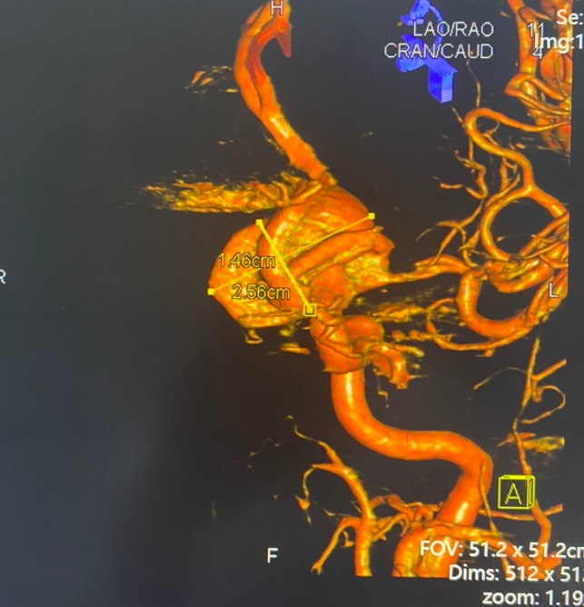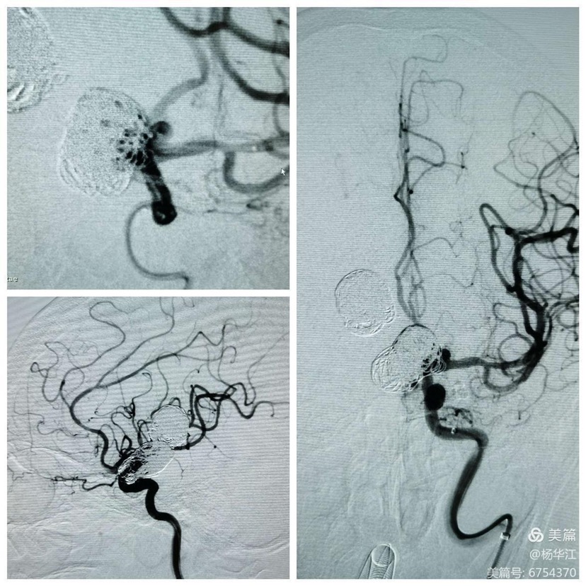 科室讨论:1.病变复杂,治疗棘手;2.手术夹闭+by pass,前循环动脉瘤可行,但后循环动脉瘤处理难度极高,风险巨大。3.介入治疗,前循环动脉瘤处理相对简单,一致认为血流导向装置结合弹簧圈是最佳选择;后循环动脉瘤的处理难度也不小,由于瘤颈超宽,需要Y形或T形支架技术辅助弹簧圈栓塞,右侧大脑后动脉自瘤体侧后方发出,支架导管超选到位有难度,更困难是,由于动脉瘤体积较大,瘤颈超宽,累及重要血管众多,弹簧圈填塞很难做到致密而不影响受累动脉,动脉瘤复发是大概率的事件。