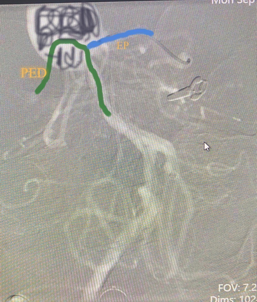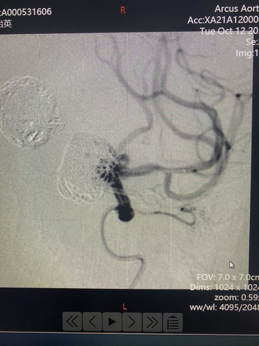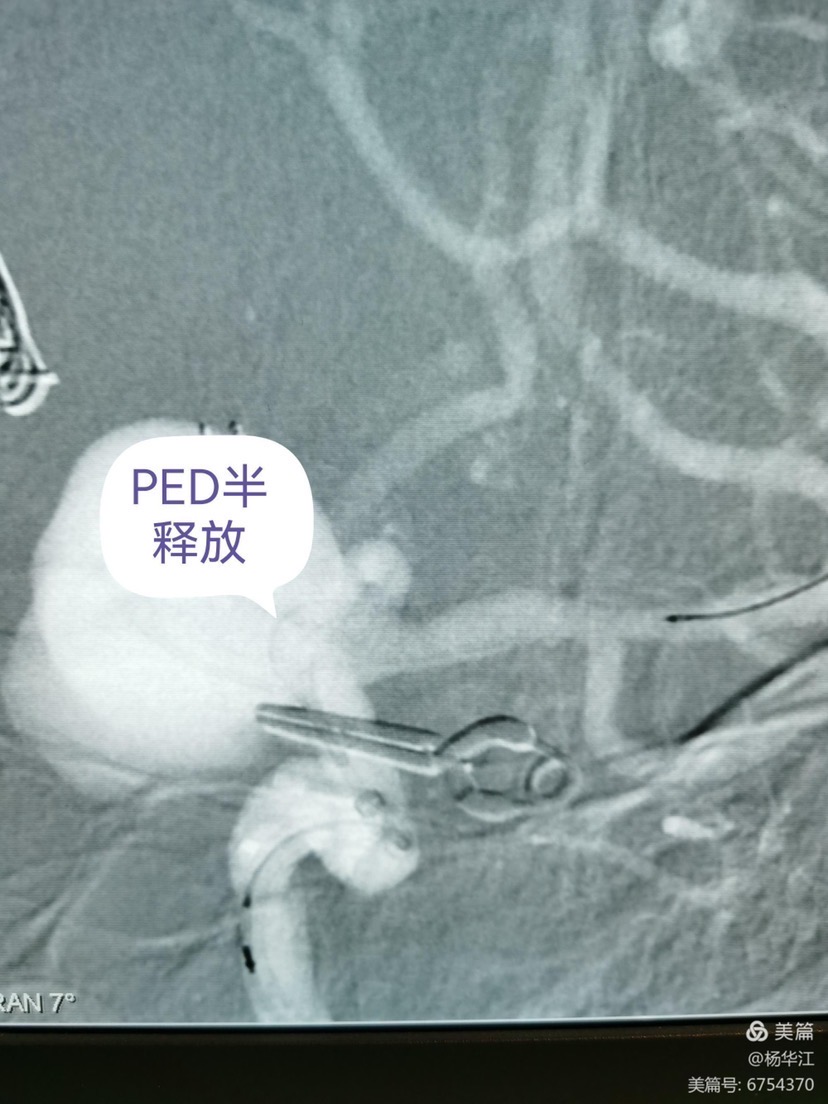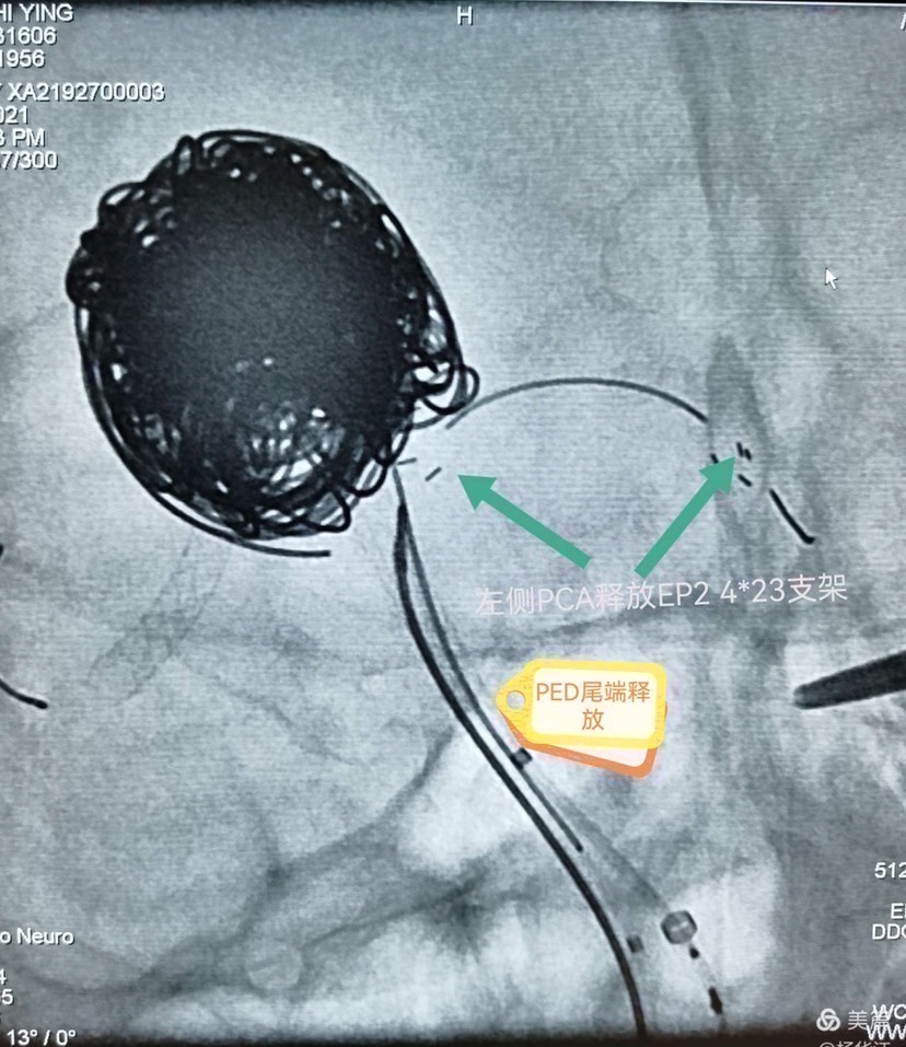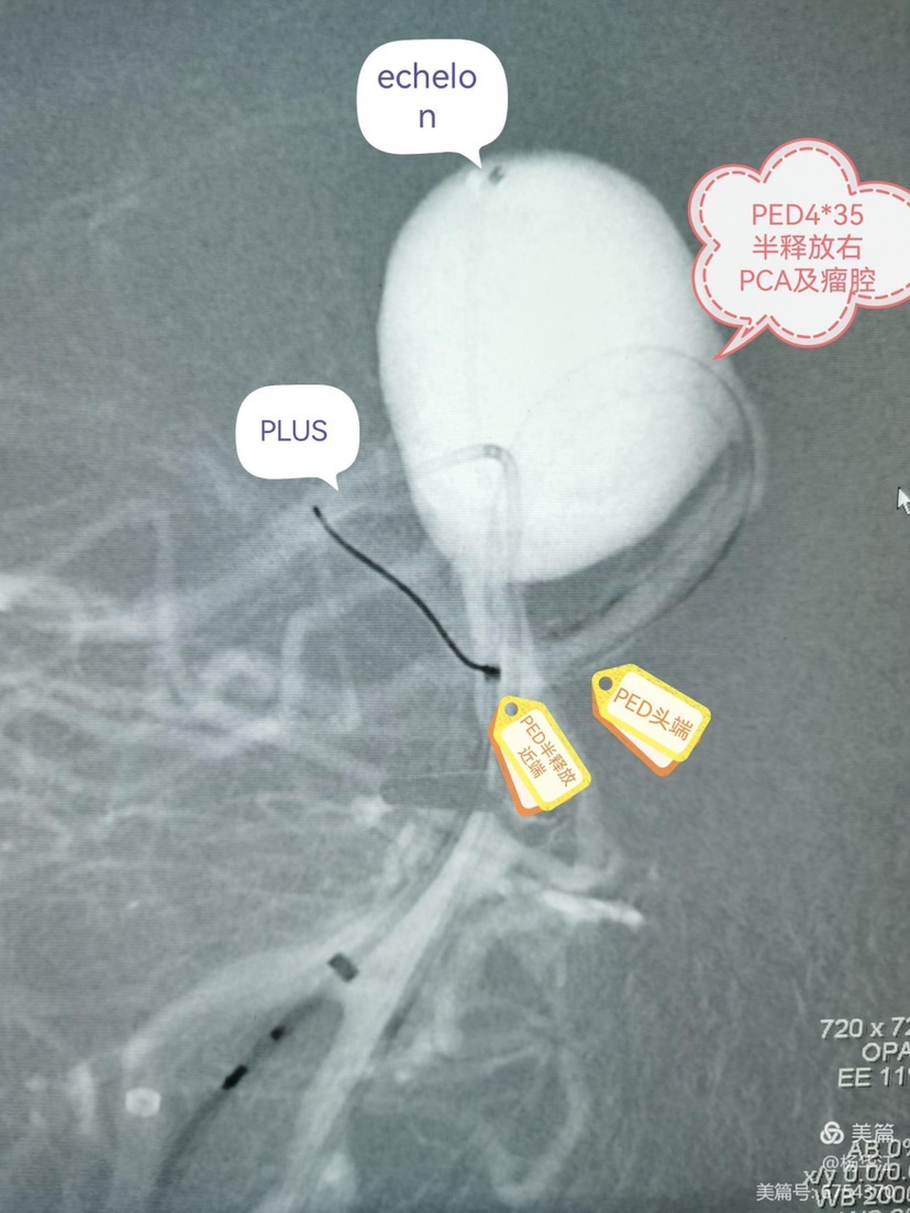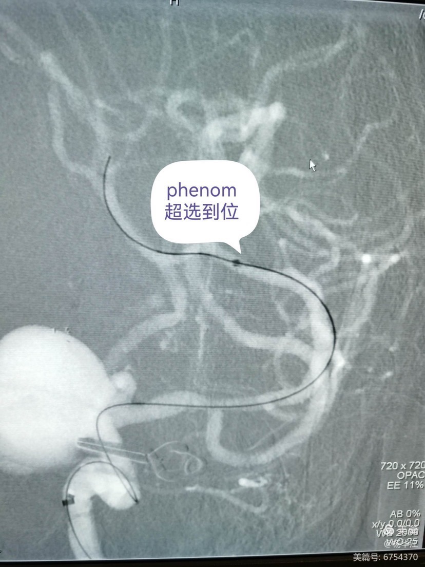 4.0x35pipeline经成襻的phenom导管缓慢送人右侧大脑后动脉远端,锚定,缓慢半释放至基底动脉中上段。